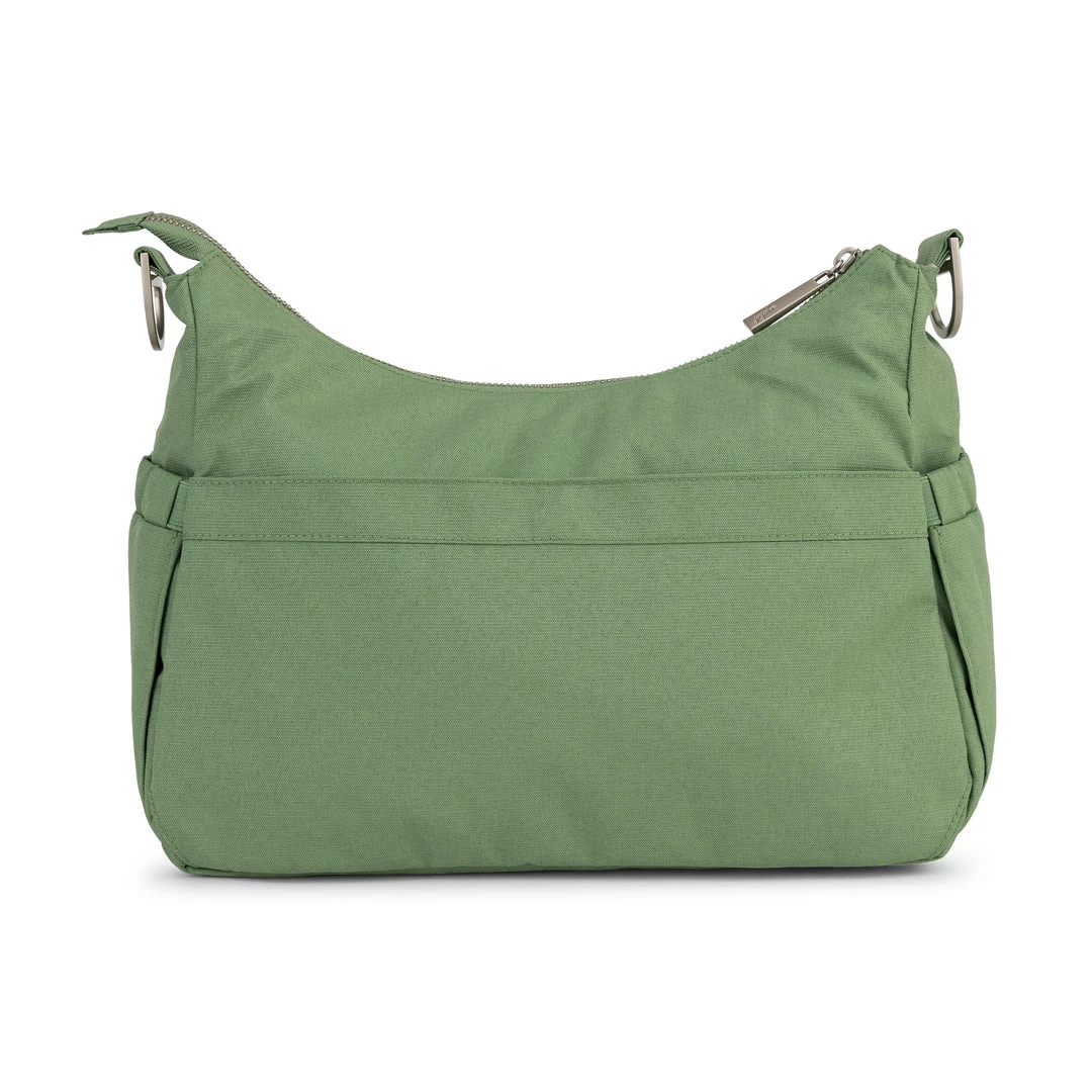 JuJuBeβs hobo-style bag will become an instant staple in your wardrobeβfrom the newborn days to long after the diapering days are done! There are plenty of pockets to keep you organized, and a top zippered closure keeps everything tucked safely inside. Features a removable messenger strap and metal swivel clips. The redesigned HoboBe strap features a chic glossy webbing, creating a lighter, easy-to-carry bag and an adjustable shoulder pad you can slide anywhere on the strap for a custom, comfy fit! The included change pad folds up small for easy transport, and can be simply removed to free up even more space. From baby bag to work bag, you need the durable, versatile JuJuBe HoboBe!