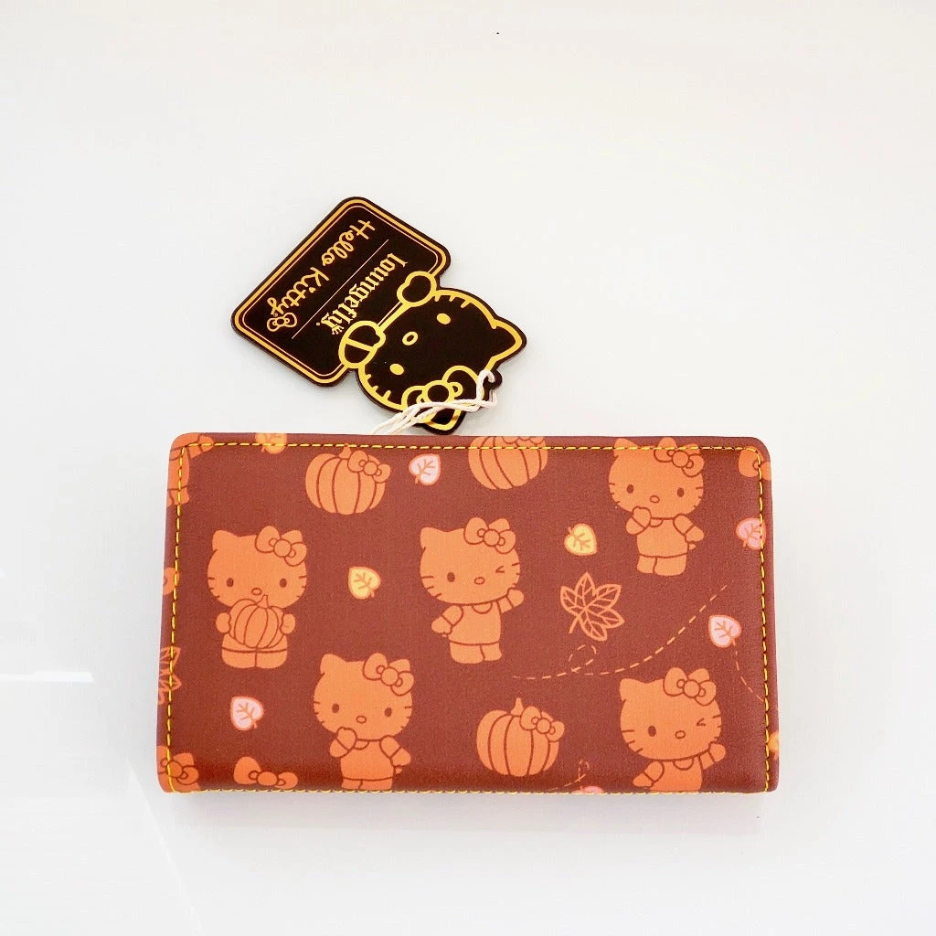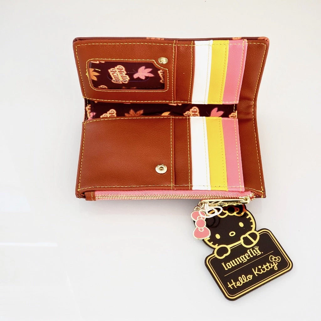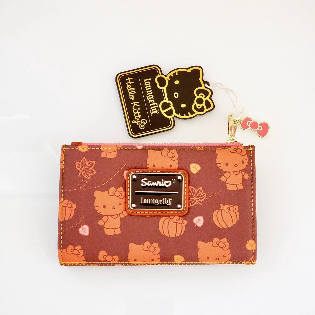 Hello Kitty is ready for autumn in Loungefly’s Pumpkin Spice Collection! Fall colors, Hello Kitty, and pumpkins adorn this kawaii wallet. Perfectly matches the Pumpkin Spice Cup crossbody or Pumpkin Spice Latte handbag to complete the set. Accented with gold details and an enamel pink bow zipper charm. Vegan leather.