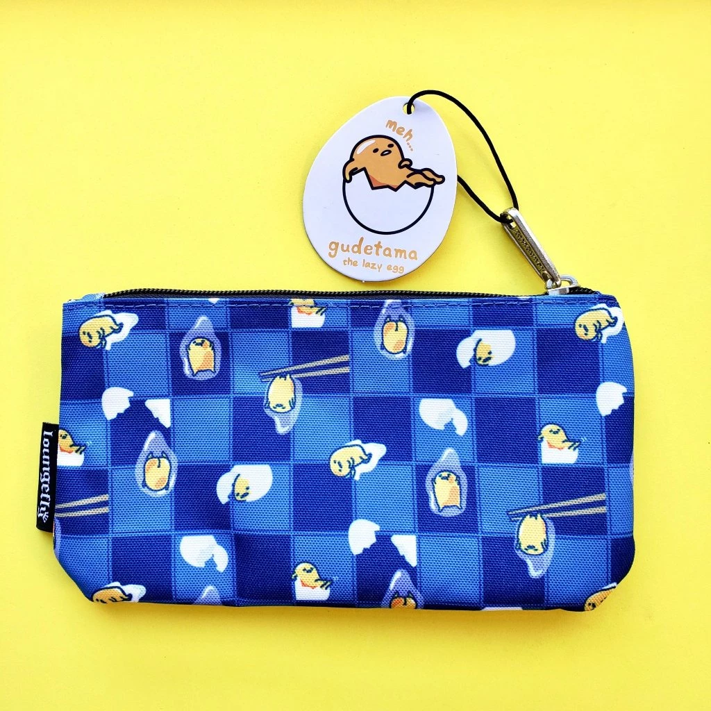 Sanrio’s famous lazy egg Gudetama has joined forces with Loungefly! The nylon pouch is great for storing school/office supplies, makeup brushes, travel essentials, and more. Features an all over print of Gudetama in different lazy positions with random chopsticks on a blue checkered pattern. Matches perfectly with the Gudetama backpack!