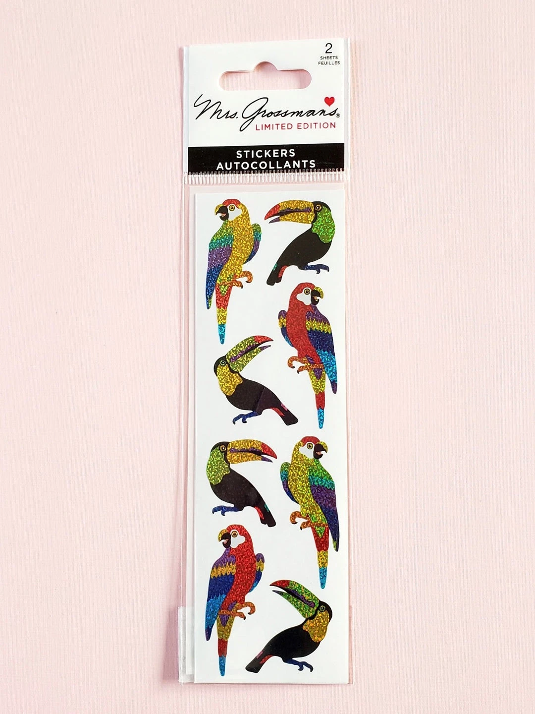 - Tropical toucans and parrots sparkle in this bird sticker set