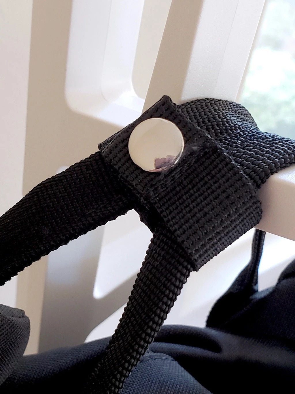 Generously sized backpack will fit older kids and adults. Large main compartment includes a laptop/tablet sleeve on the padded interior. Smaller zippered pocket is located in front, along with drink pockets on each side. The light gray & white striped contrasting interior makes it easier to find things! At the top of the bag, you’ll find two handles that can be easily snapped together and then carried around like a tote.