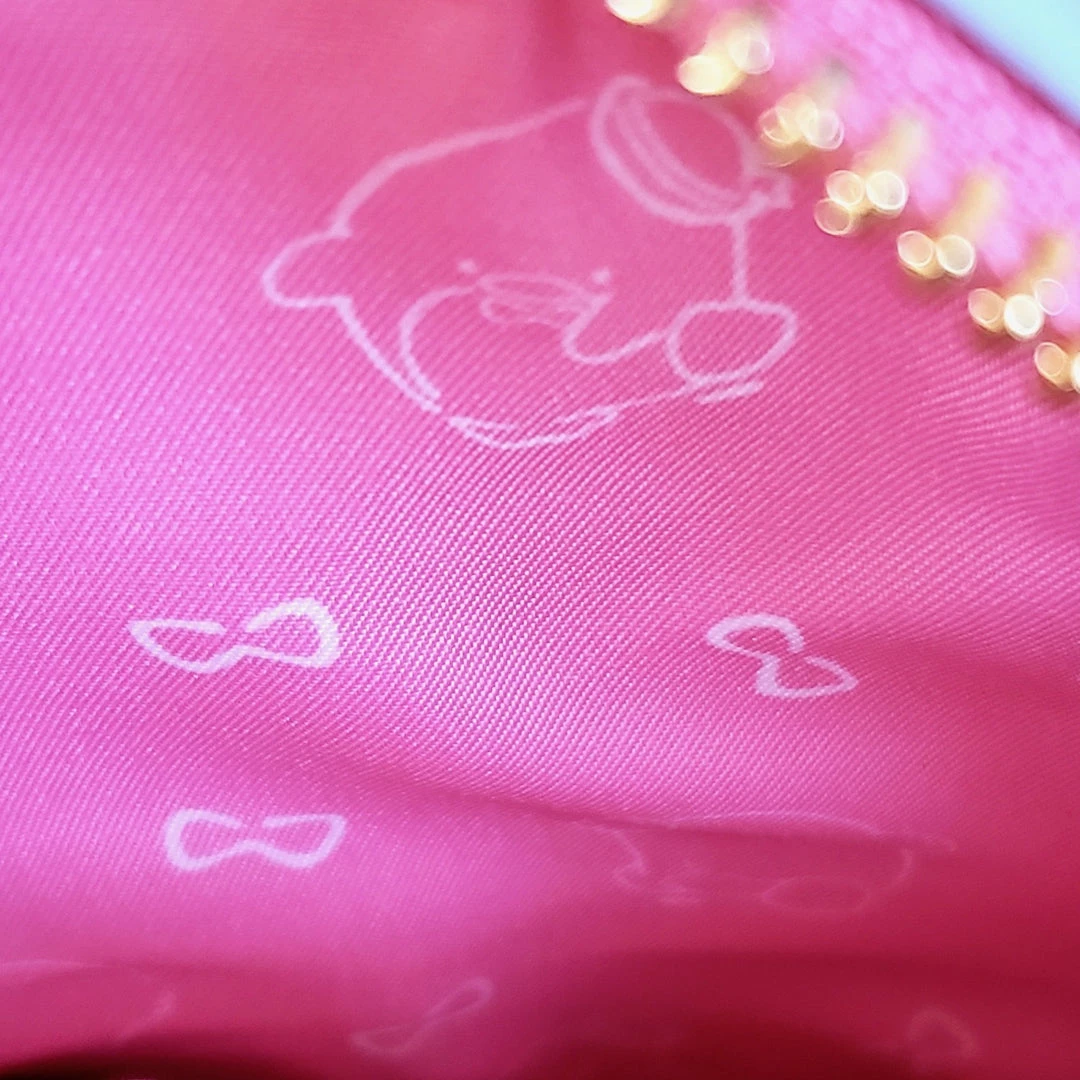 The Sanrio Tuxedosam Crossbody is made of faux/vegan leather with suede-like trim. The handbag has an adjustable shoulder strap that is detachable, gold metal hardware, and embossed Tuxedosams all over! Inside the bag, there is a zippered pocket and a pink fabric lining featuring a super cute all over print of Tuxedosams and bow ties.ย