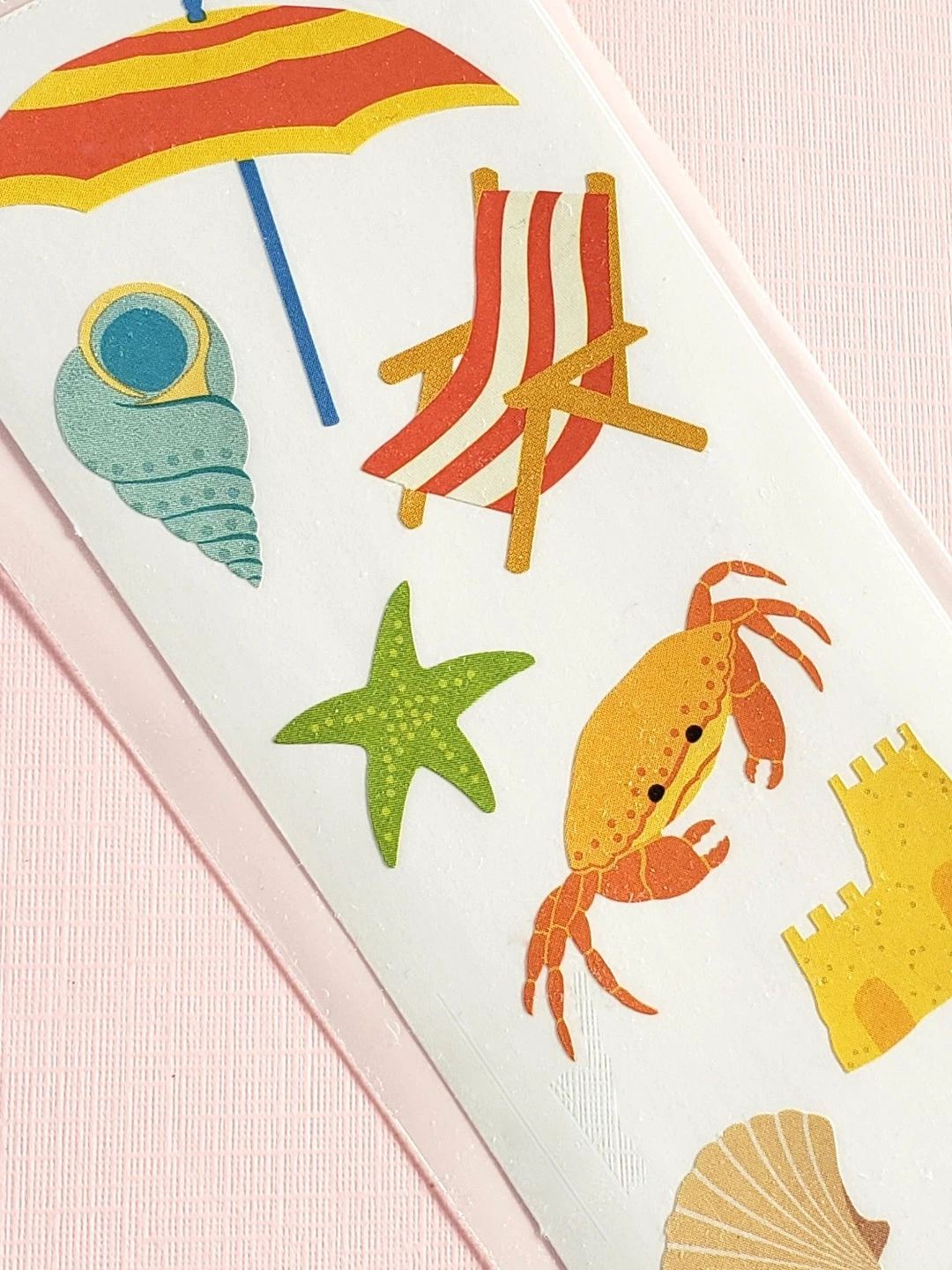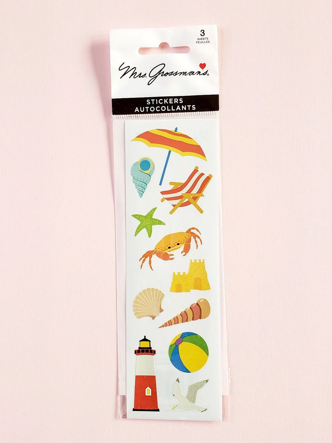 - Shells, sandcastles, and a lighthouse are included in this beach themed sticker set