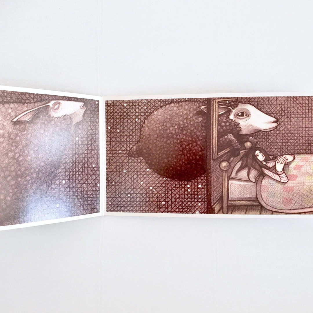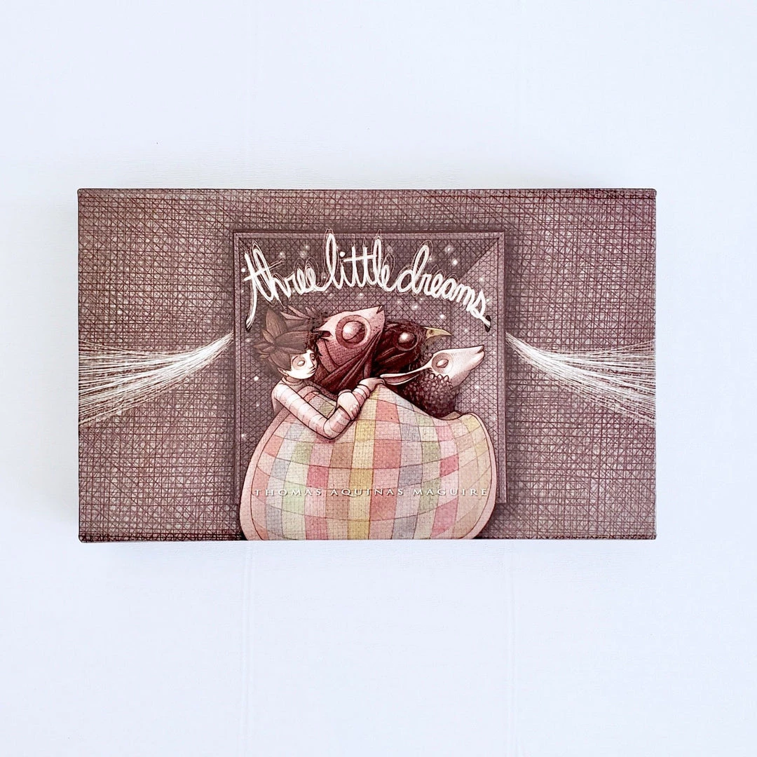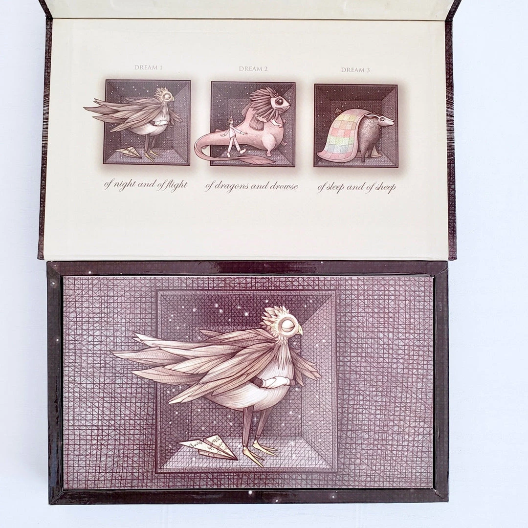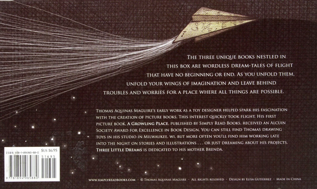 Fold-out picture books featuring three whimsical dreams of flight: a young boy riding a flying dragon, a star transforming into a floating sheep, and a bird soaring on a paper airplane.ย