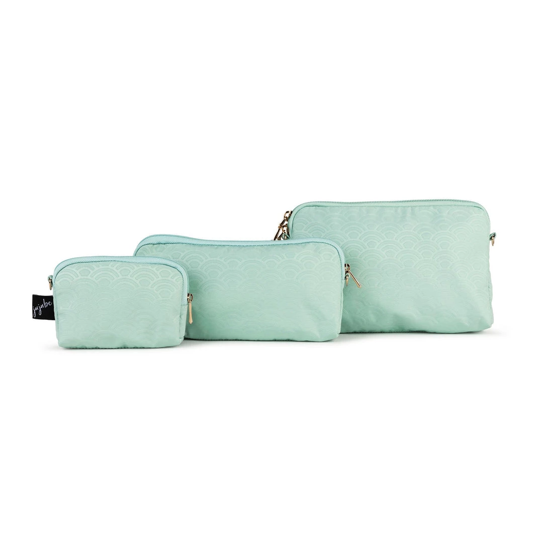 Get ready to take your organization skills to the next level. This set includes three mini bags that you can use to organize your diaper bag or as standalone bags. When you pack with Be Set, youβll never have to dig around the bottom of your bag for small items again. The set comes with two detachable straps for use a wristlet or shoulder bag. You can also use them to hang the bags from your stroller.