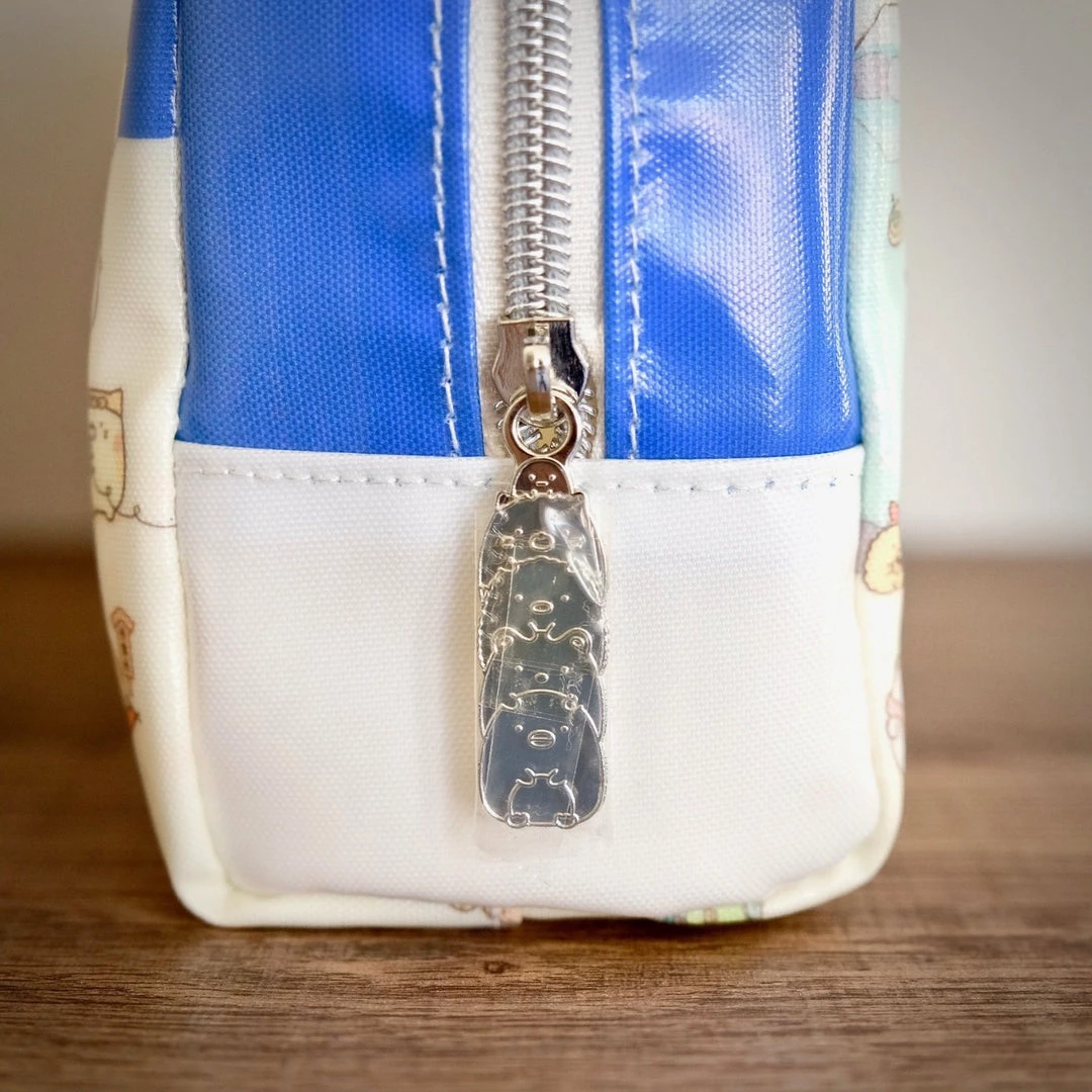 The zippered pouch is made of a durable, coated fabric with a cute polka dotted interior. Attached to the zipper is a silver-toned charm of the Sumikko Gurashi characters.