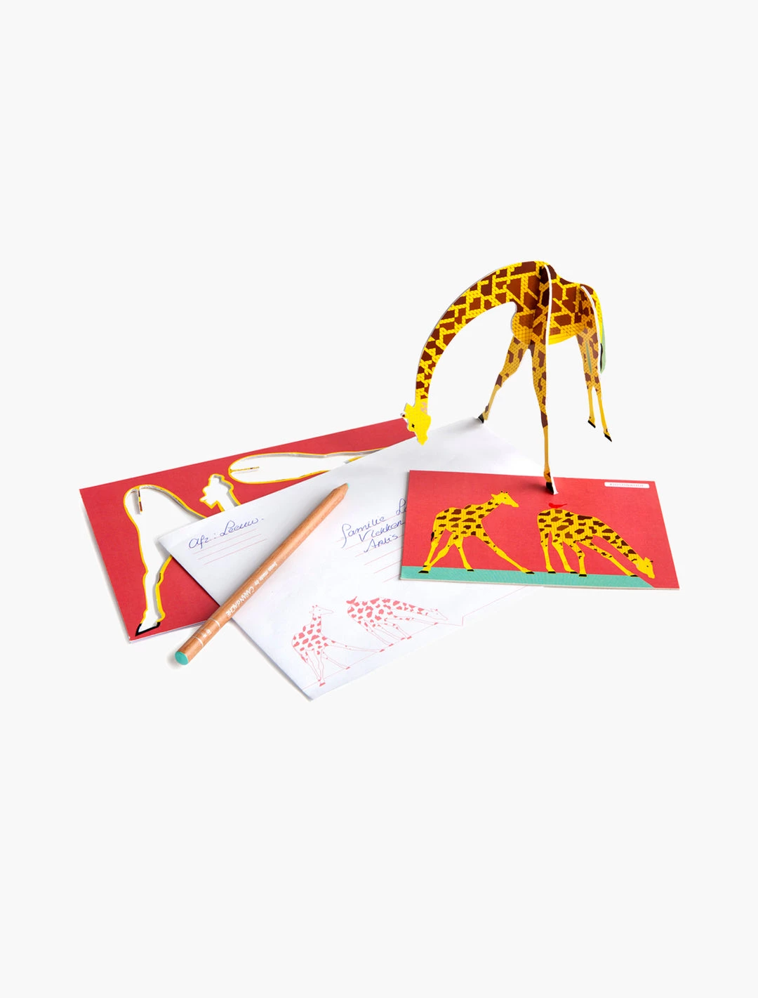 A pop out card is more than a card, itβs a little present to send! Send it to a child you want to surprise, and the giraffe will get a special place in the his or her room. Includes envelope and small giraffe greeting card to write a sweet note on. Studio ROOF is a Dutch family business that creates unique and whimsical paper goods.
