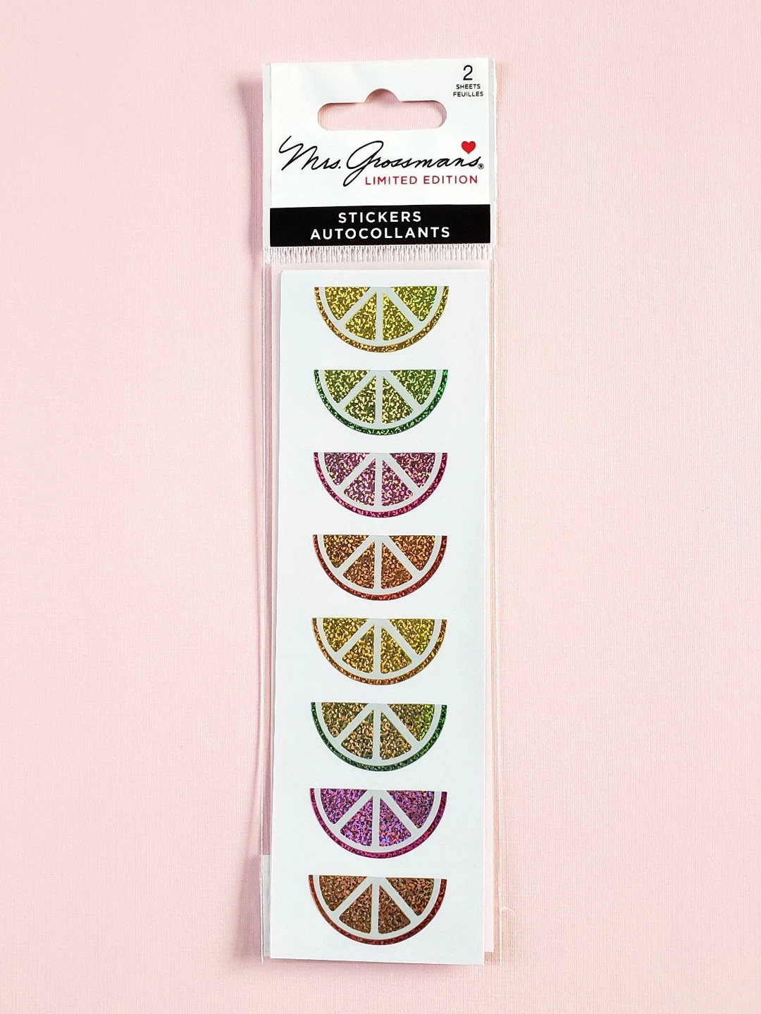 - Cute, glittering slices of citrus in yellow, green, pink, and orange!