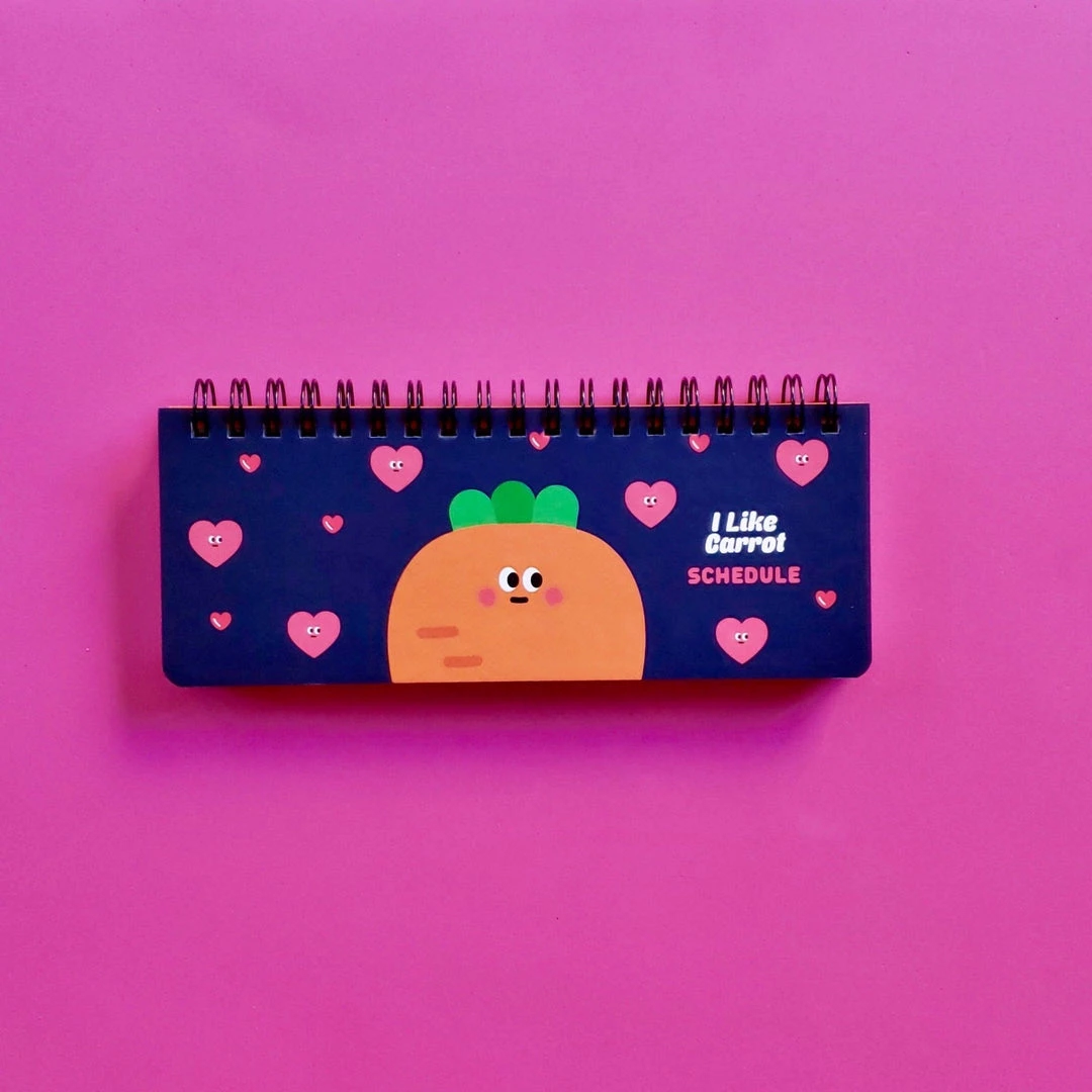 Super cute and practical weekly scheduler from PINKFOOT! The navy blue planner features a large orange carrot surrounded by hearts on the cover and 54 pages with cute graphic details. The planner is spiral bound with a hard cover.