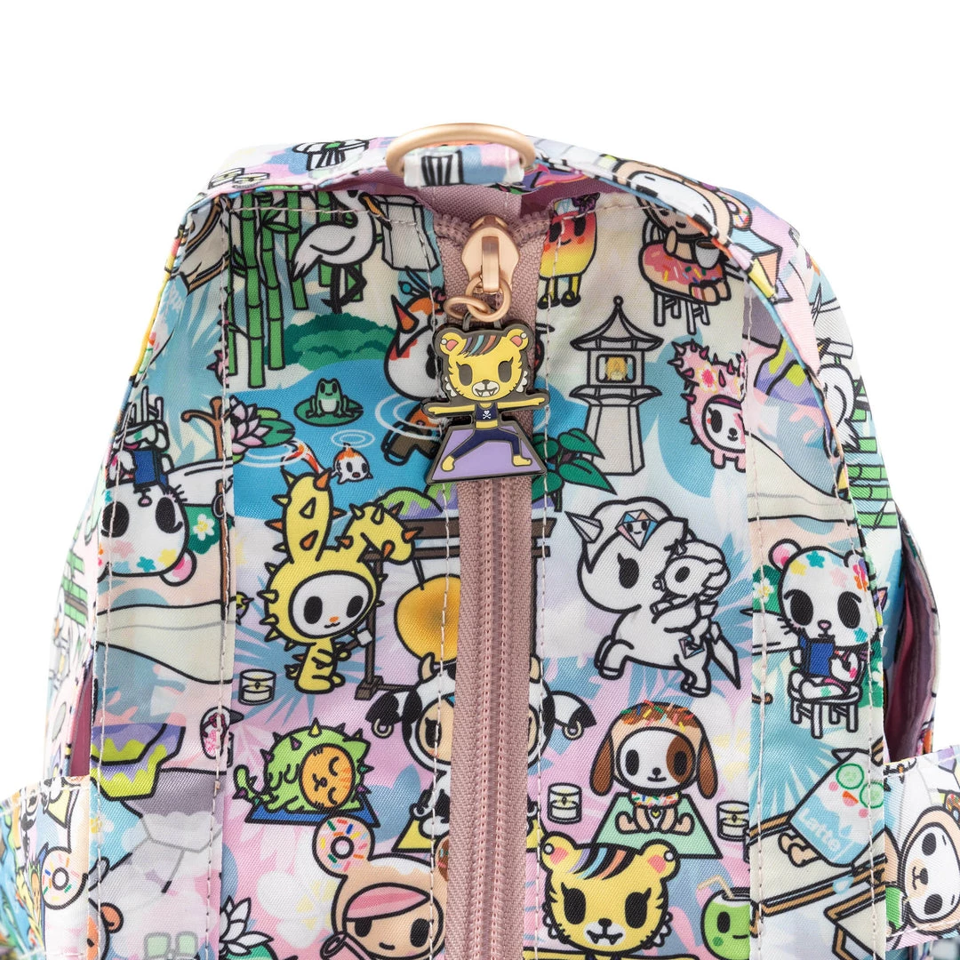 - Pocketsย โ 2 mesh pockets and one extra-long zippered pocket in main compartment; Zippered closure on main compartment; Large back pocket with snap closure; 3 exterior front pockets