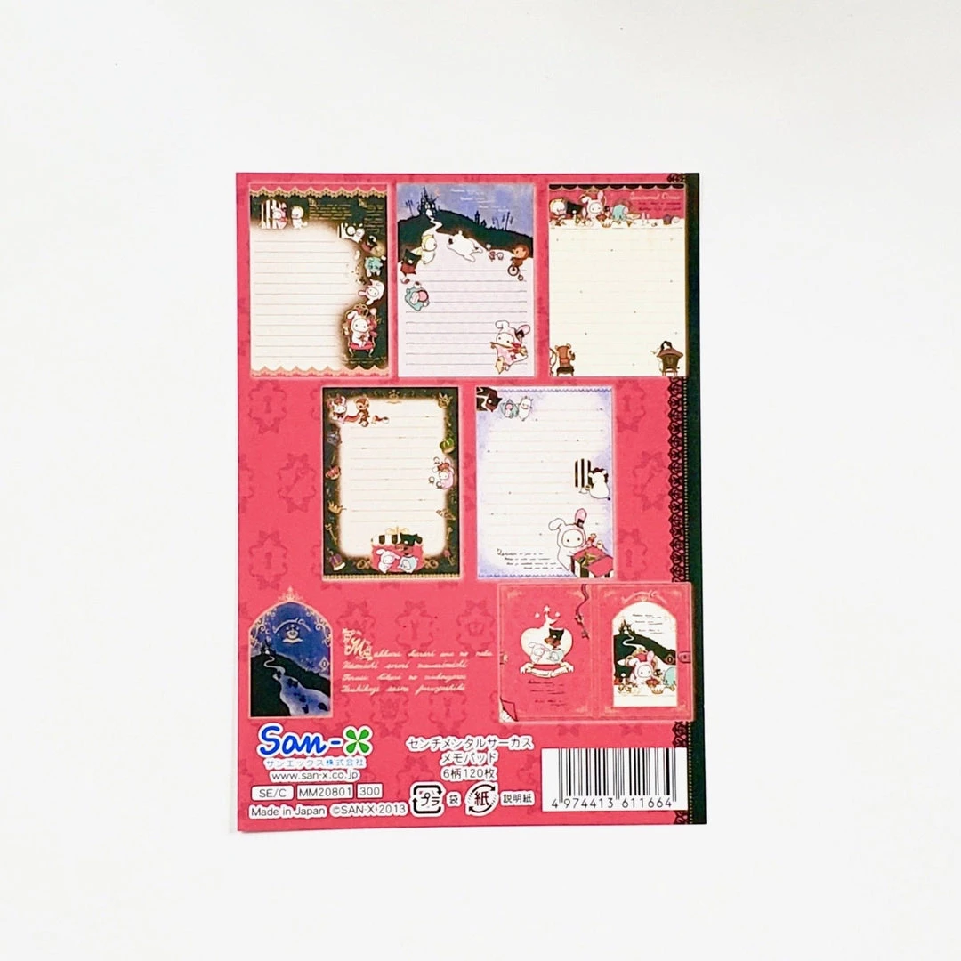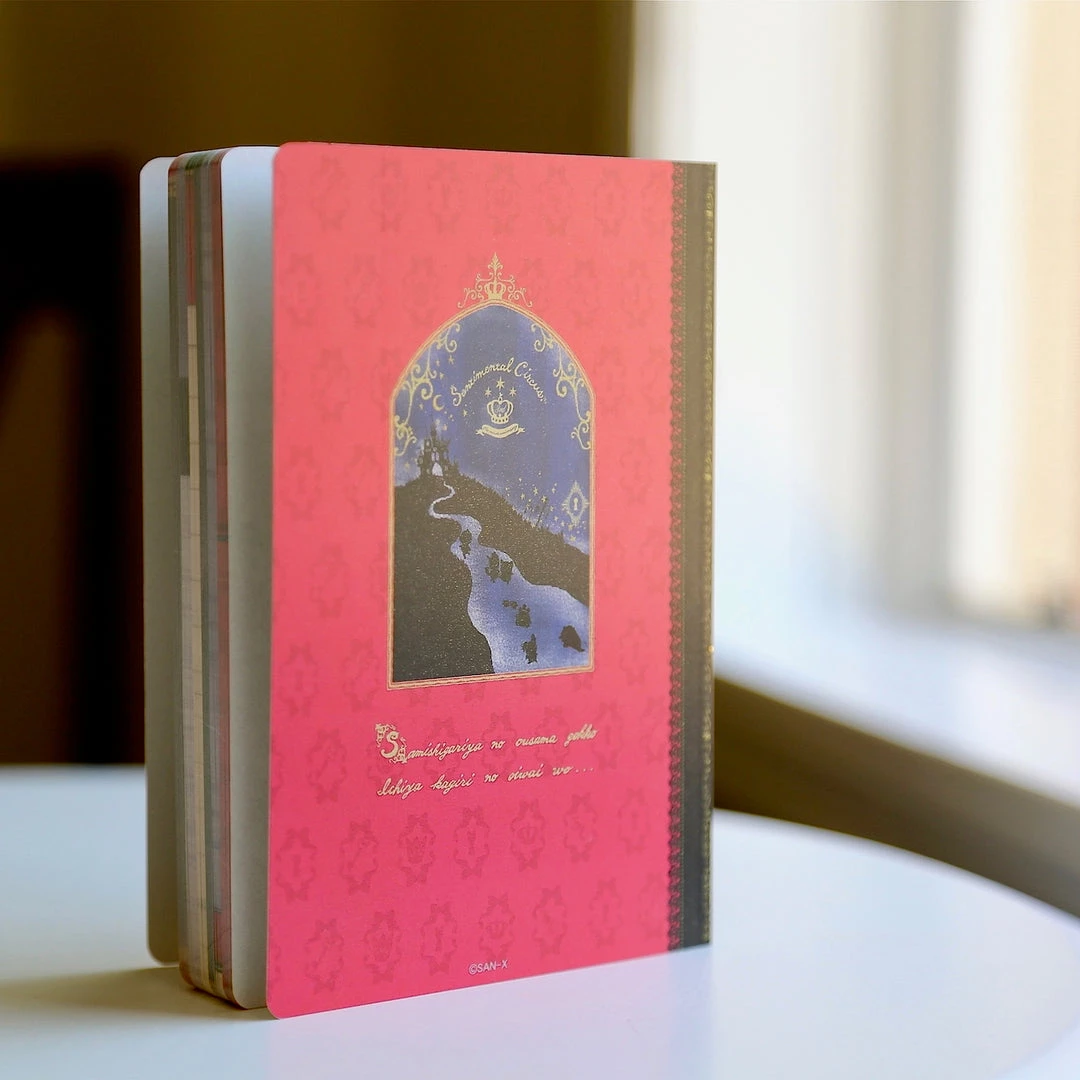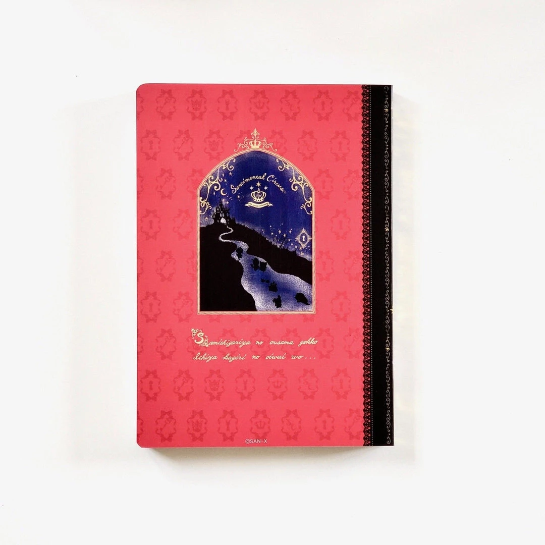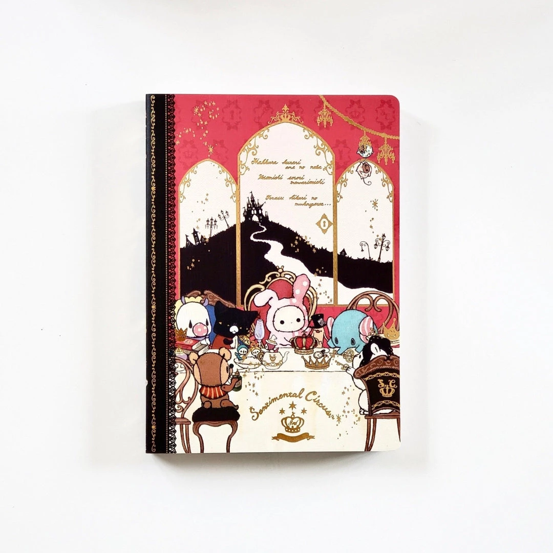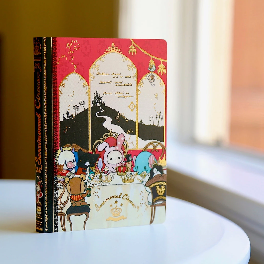 The Secret Anniversary collection was born from a collaboration with Alice and the Pirates (a pirate-punk lolita clothing line) and San-X Sentimental Circus. The theme: a royal tea party with a hint of goth. Shappo, the royal ringmaster, is enjoying a spot of tea with his royal subjects. The cover has gold reflective details.