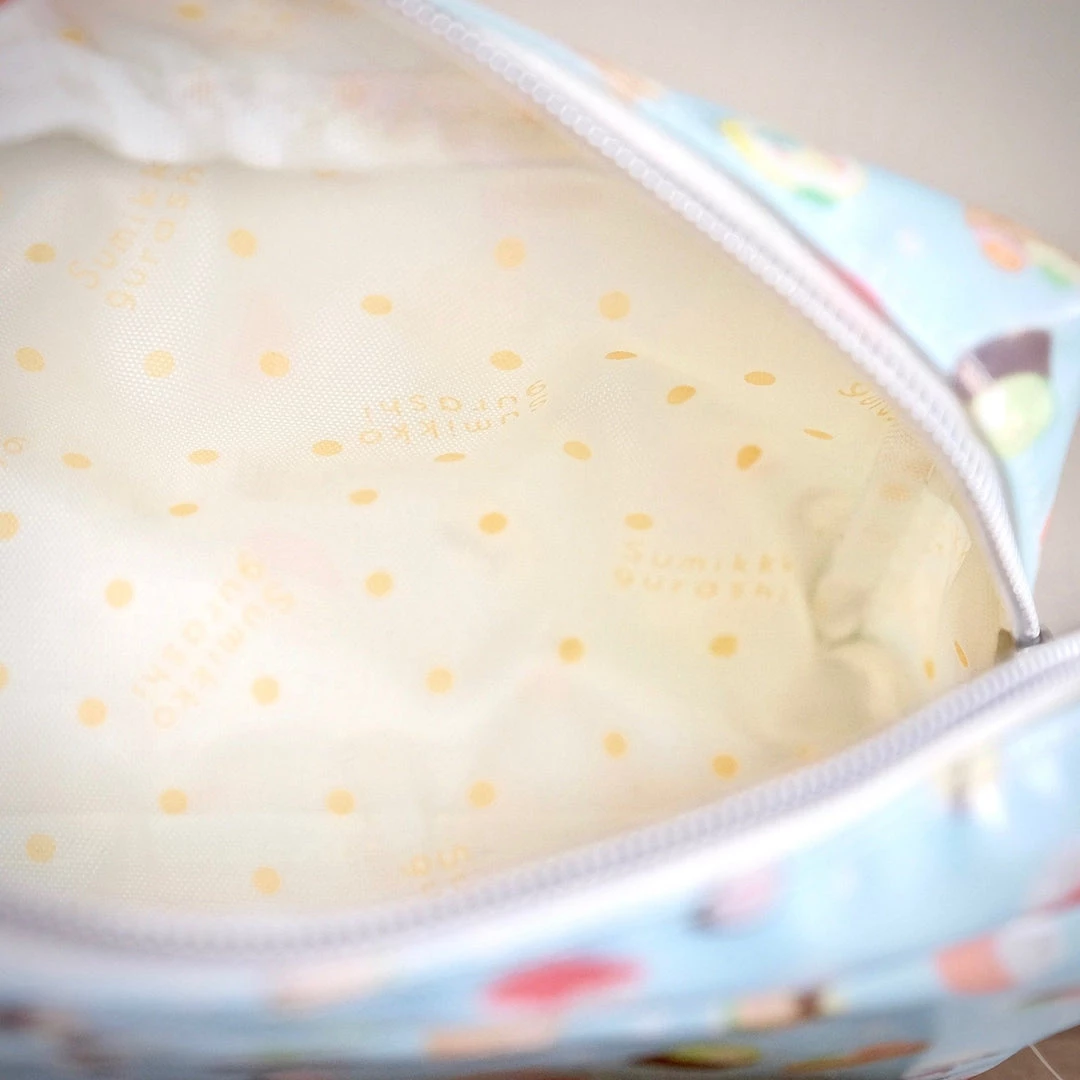 The pastel blue zippered pouch is made of a durable, coated fabric with a cute polka dotted interior. Attached to the zipper is a silver-toned charm of the Sumikko Gurashi characters.