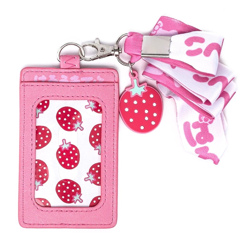 Our Hello Kitty Berrylicious Lanyard with Cardholder is perfect for displaying your name badge or ID. Show off your favorite pins on the lanyard! The lanyard features printed details, polyester strap, rubber strawberry charm, and a vegan/faux leatherΒ cardholder.Β
