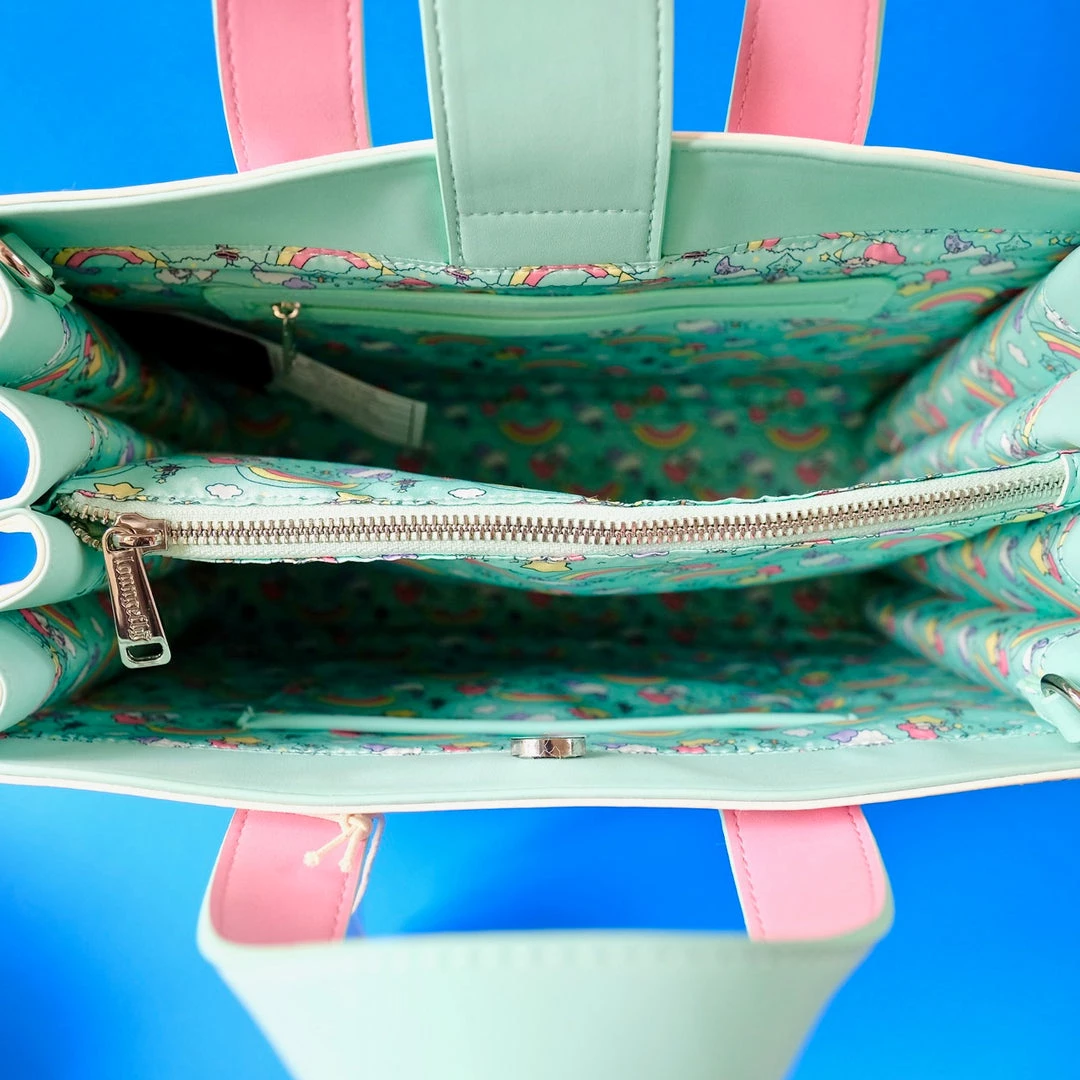 The Little Twin Stars Rainbow Cloud Crossbody Bag is made of vegan/faux leather. The bag has a detachable, adjustable shoulder strap with one side being pink and the other mint green. The interior is lined in an adorable matching print fabric. There are two large compartments with a zippered pocket divider, one side slip pocket, and one side zippered pocket. There are thoughtful details like metal feet on the bottom of the purse and a magnetic button closure!