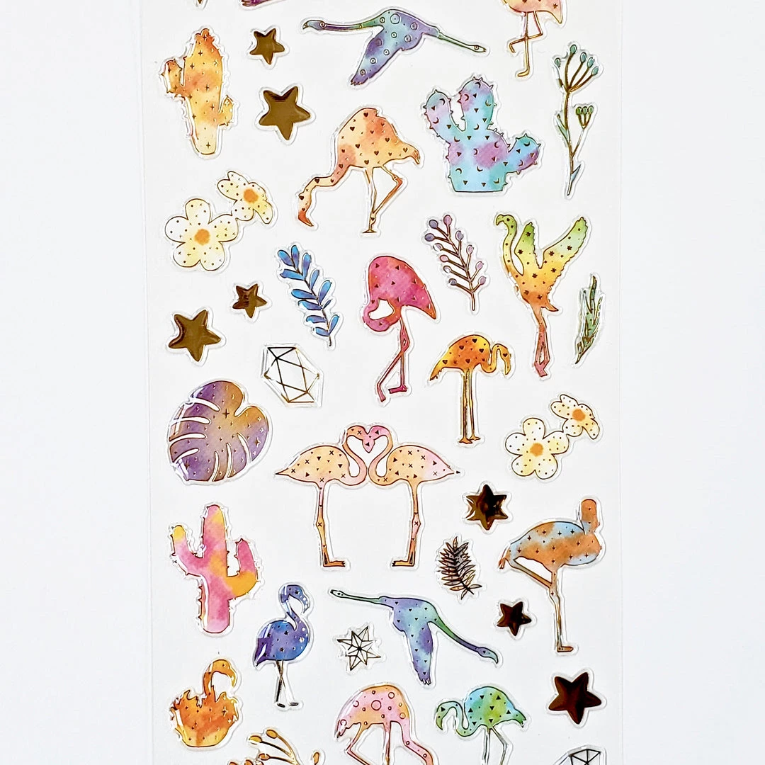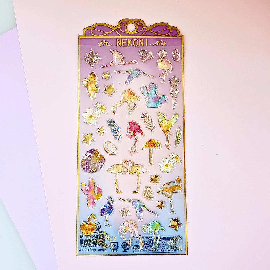 Add pretty details to your project with our Nekoni Crystal Gel flamingo stickers! These raised stickers are translucent with gold details and in bright tropical colors.