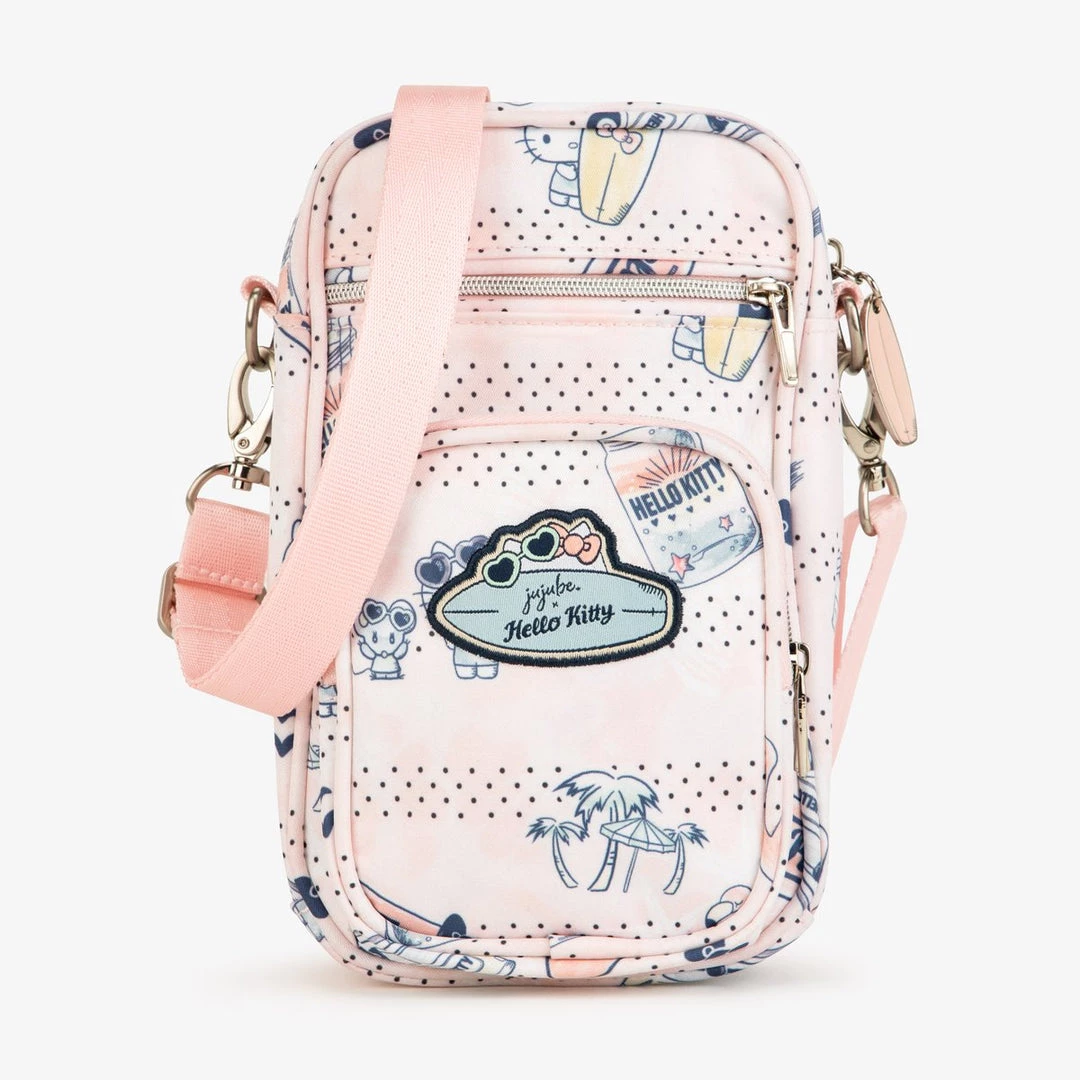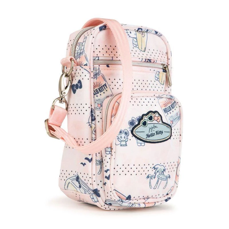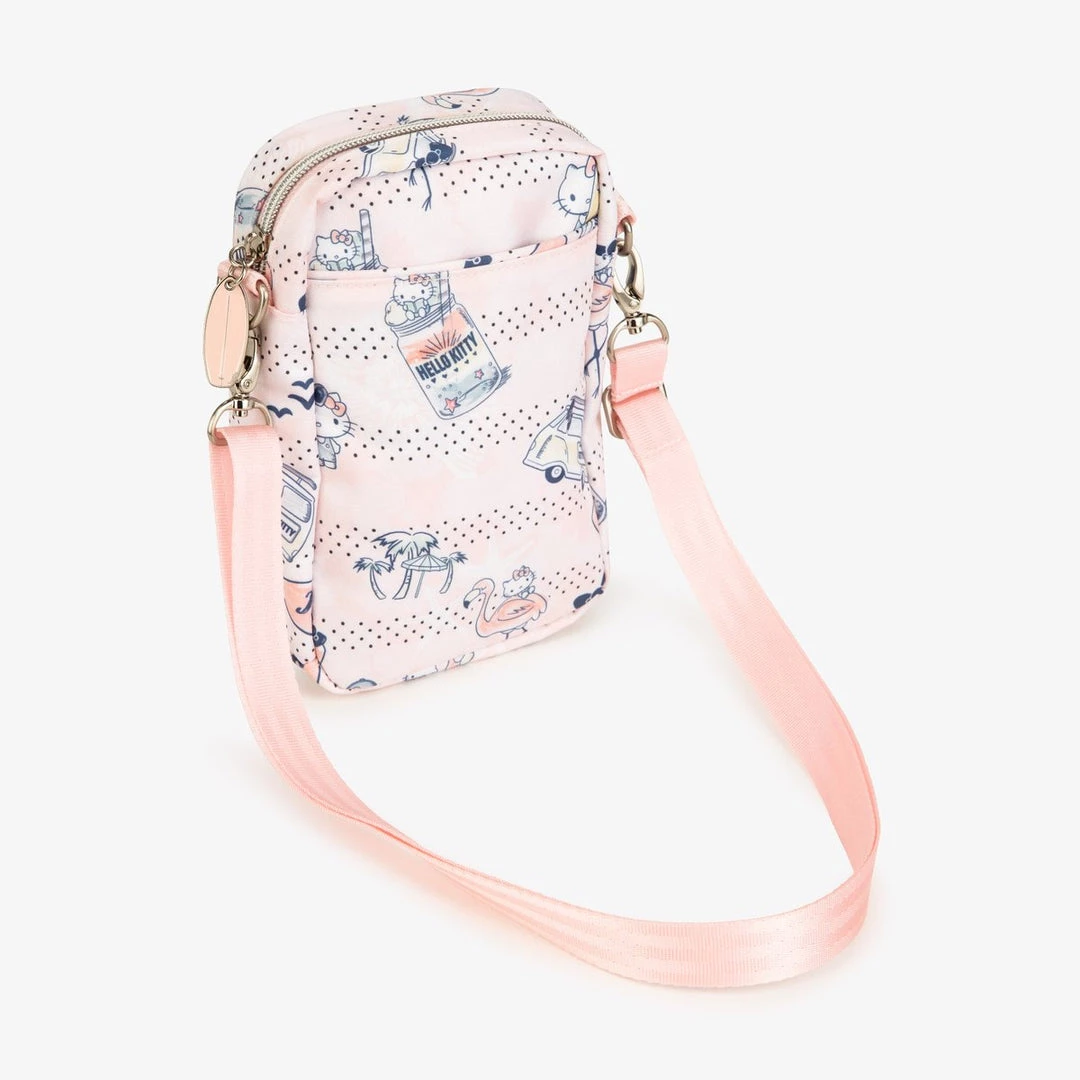 Hello Summer! This refreshing pale pink print layers all of Hello Kittyβs favorite summer pastimes. Take a ride with Hello Kitty on a flamingo, on her yellow surfboard or in her matching beach cruiser, then relax with a good book while sipping something cool. Grab a pair of heart-shaped sunnies with Hello Kitty and her friend Joey and observe the sea foam lining sprinkled with sea birds, palm trees, hearts, and more!