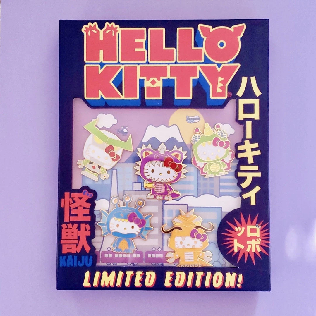 Hello Kitty has gone kaiju in this extremely Limited Edition collector pin set by Loungefly! Hello Kitty embodies 5 different types of kaiju film monsters in this collaboration: Air, Land Sea, Mecha, and Sky. Each pin is made of painted enamel with shiny gold details. On the back of the pins, you’ll find Loungefly’s crown debossed logo noting the 600 piece limited edition.