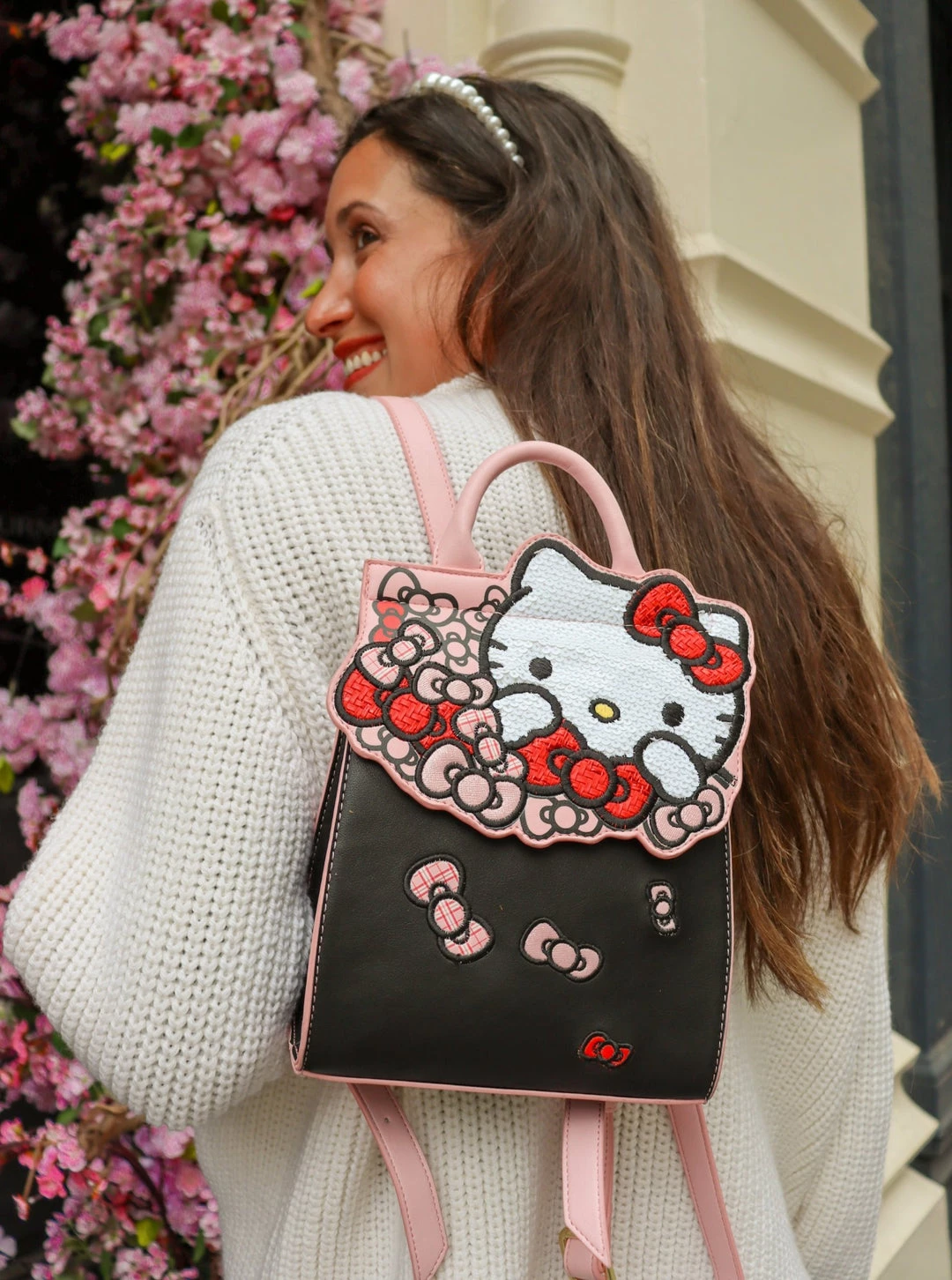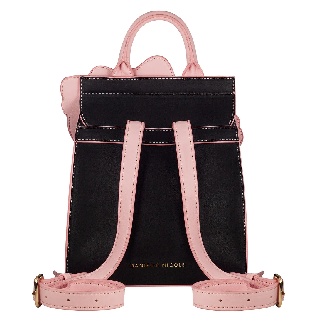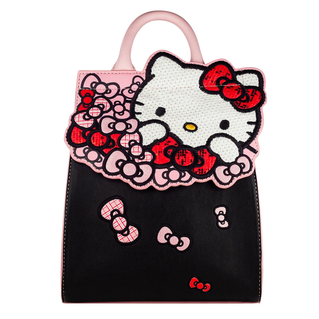 Bow obsessed and always looking your best! The Hello Kitty Bow Backpack keeps you stylish on the go. FeaturingΒ a sleek black base with contrasting pink edge paint. The front flap showcases Hello Kitty herself in a white sequin fabric, and a bouquet of bows in plaids, shimmer, and weave fabrics. Keep all your essentials at hand by using the interior pocket, and adventure with ease using the adjustable straps.