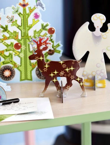 A pop out card is more than a card, itβs a little present to send! This magical reindeer is a thoughtful way to send a lasting, heartfelt holiday greeting. Includes envelope and small greeting card to write a sweet note on. Studio ROOF is a Dutch family business that creates unique and whimsical paper goods.