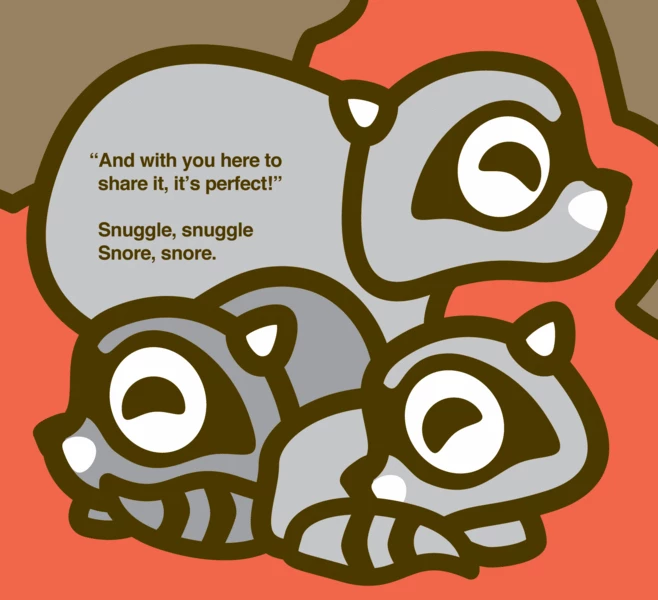 It’s time to find a place to sleep. Rokko the baby raccoon is sure he can find the perfect spot. He doesn’t need help from anyone, especially not his mommy. But when he finally does find the perfect spot, something is missing… what could it be? Perhaps someone to snuggle with?