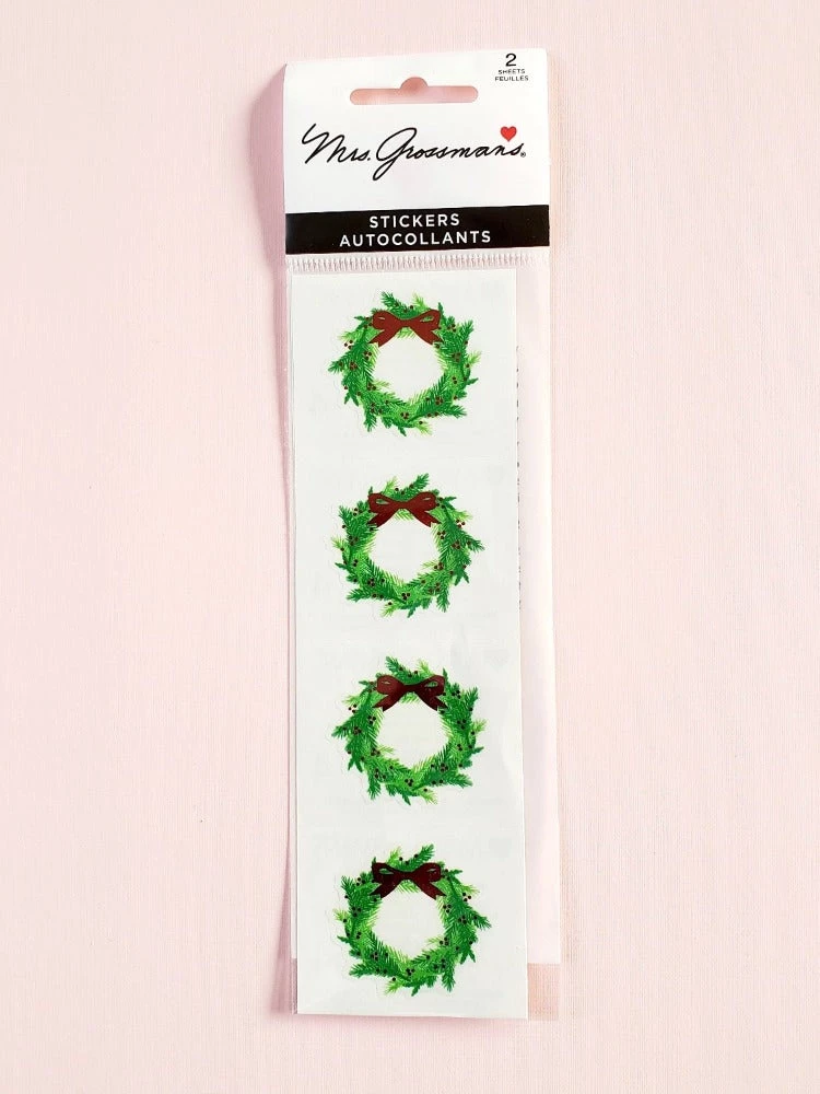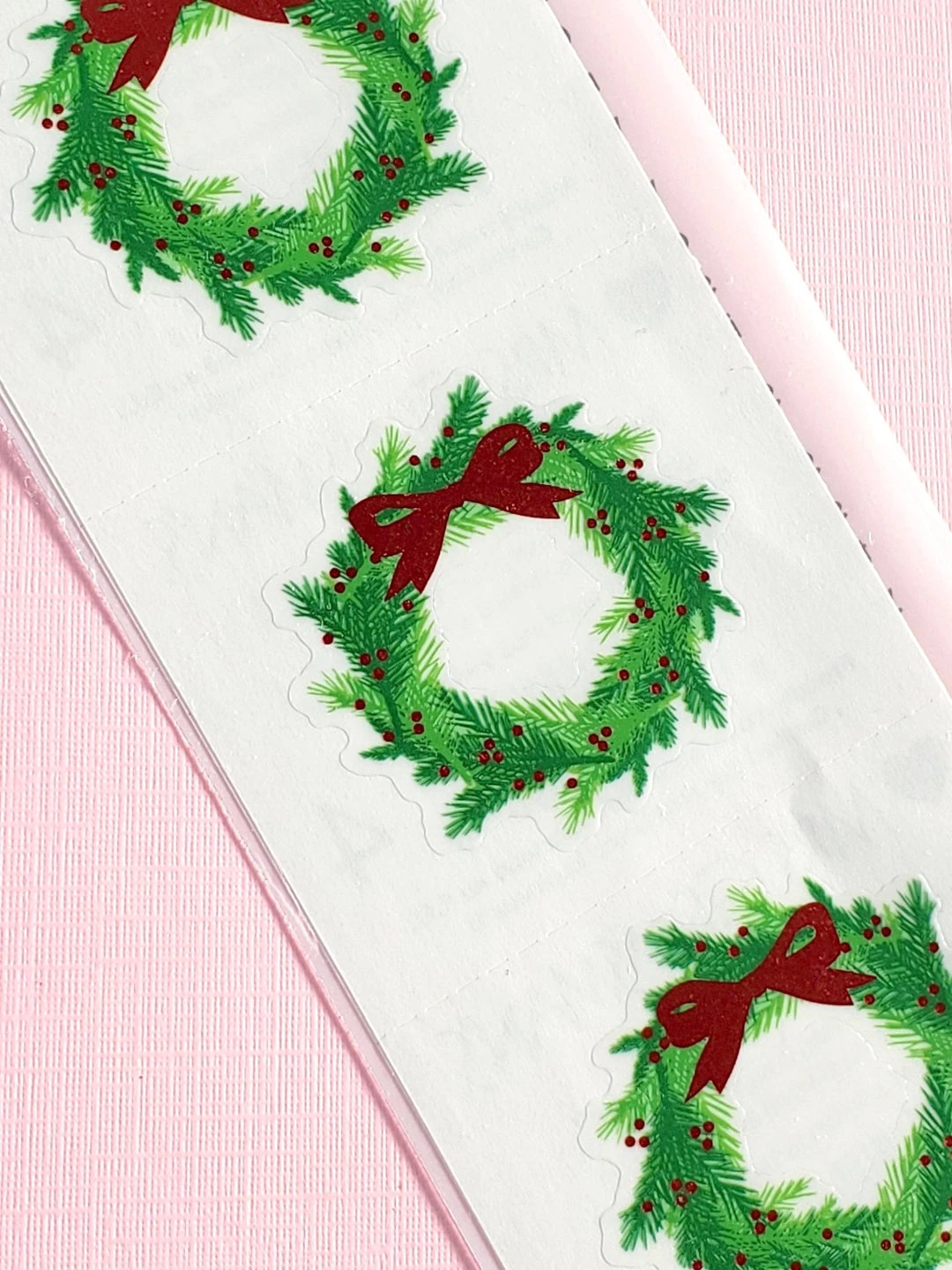 - Pretty wreath stickers with red foil accents, the perfect touch for making cards or sealing Christmas card envelopes!