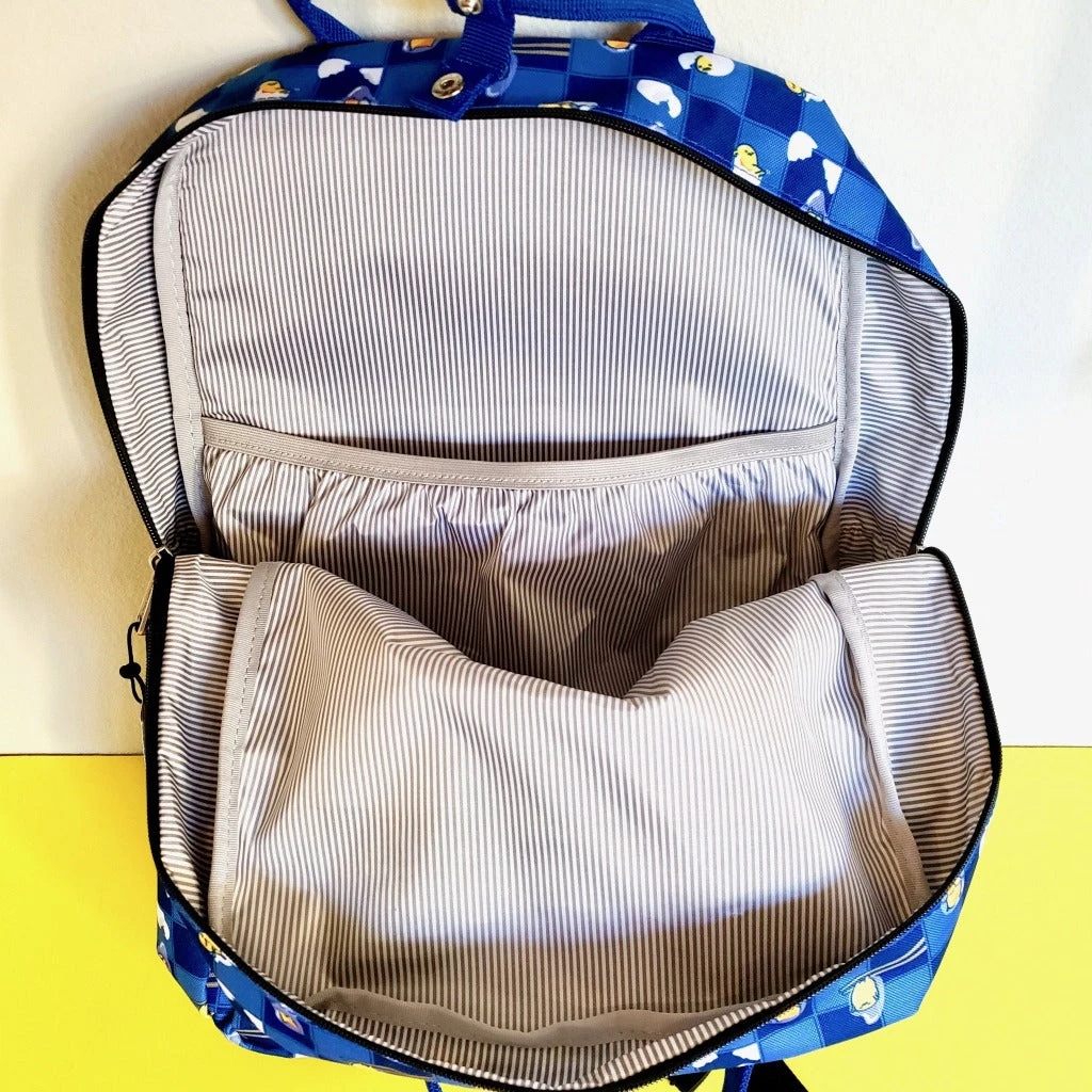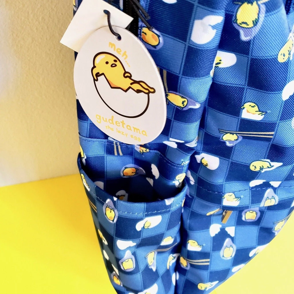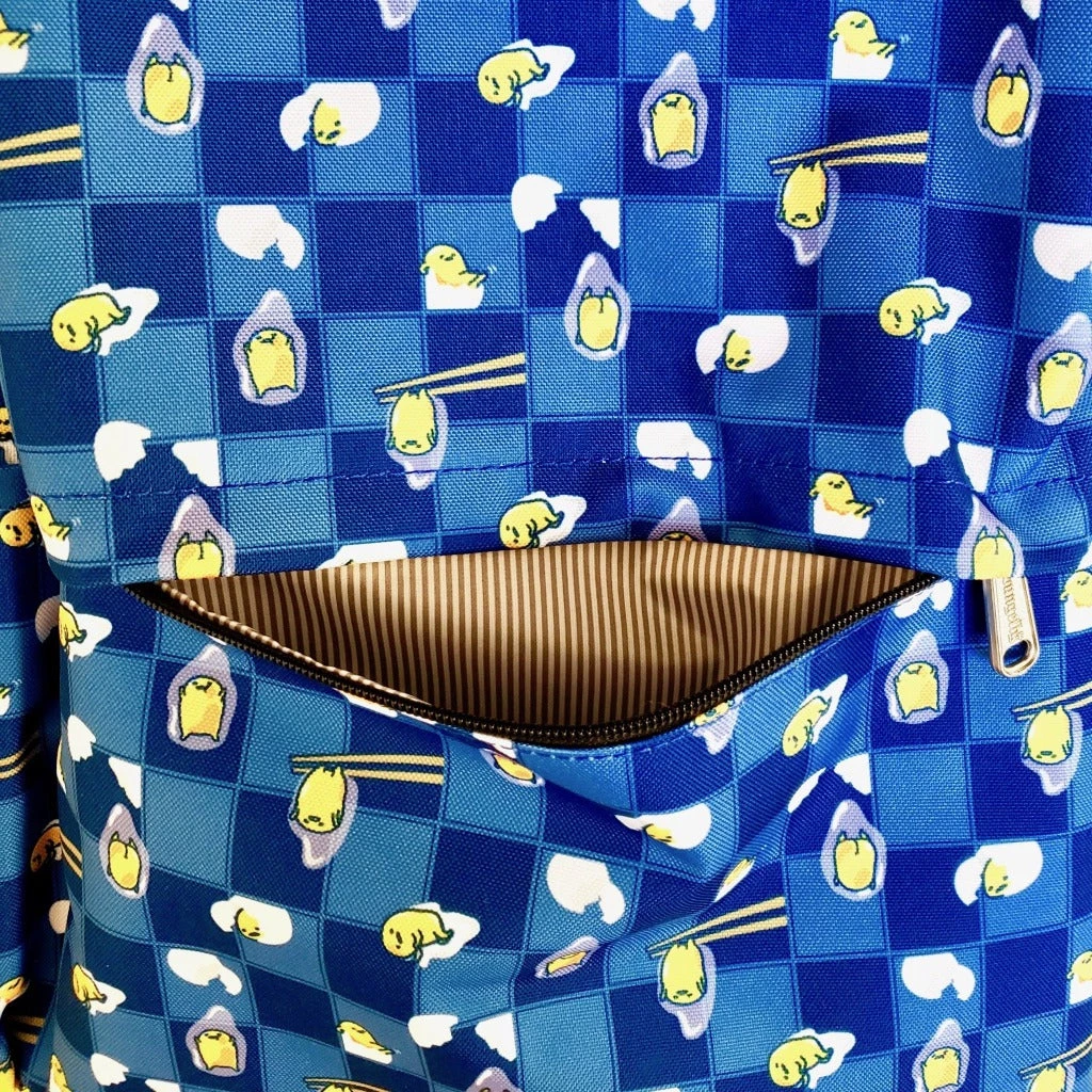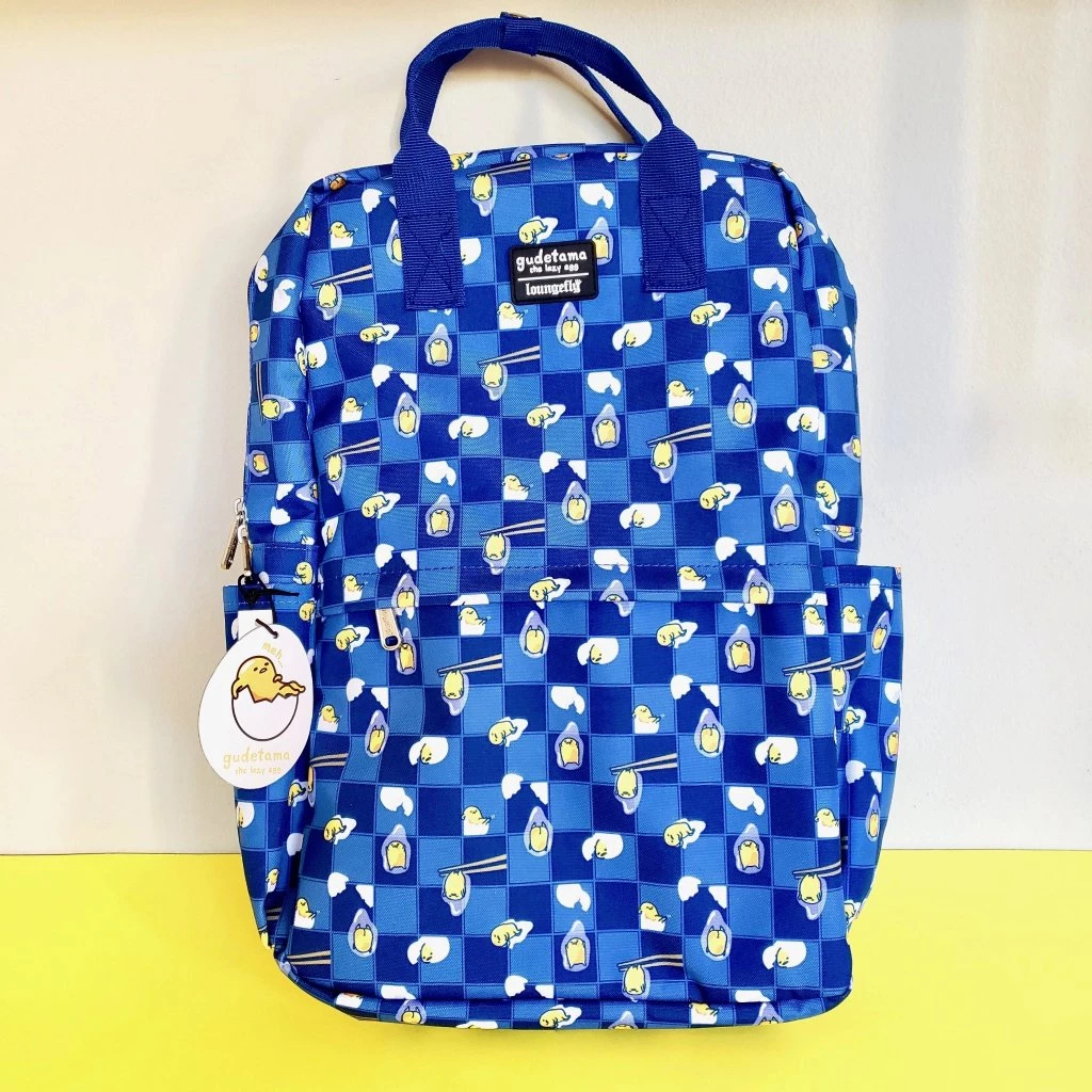Sanrio’s famous lazy egg Gudetama has joined forces with Loungefly to come up with this cool blue backpack! Features an all over print of Gudetama in different lazy positions with random chopsticks on a blue checkered pattern. Generous sized backpack is great for older kids and adults – perfect for school, travel, and more!