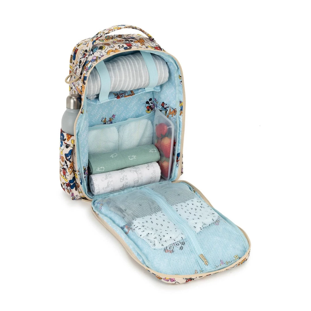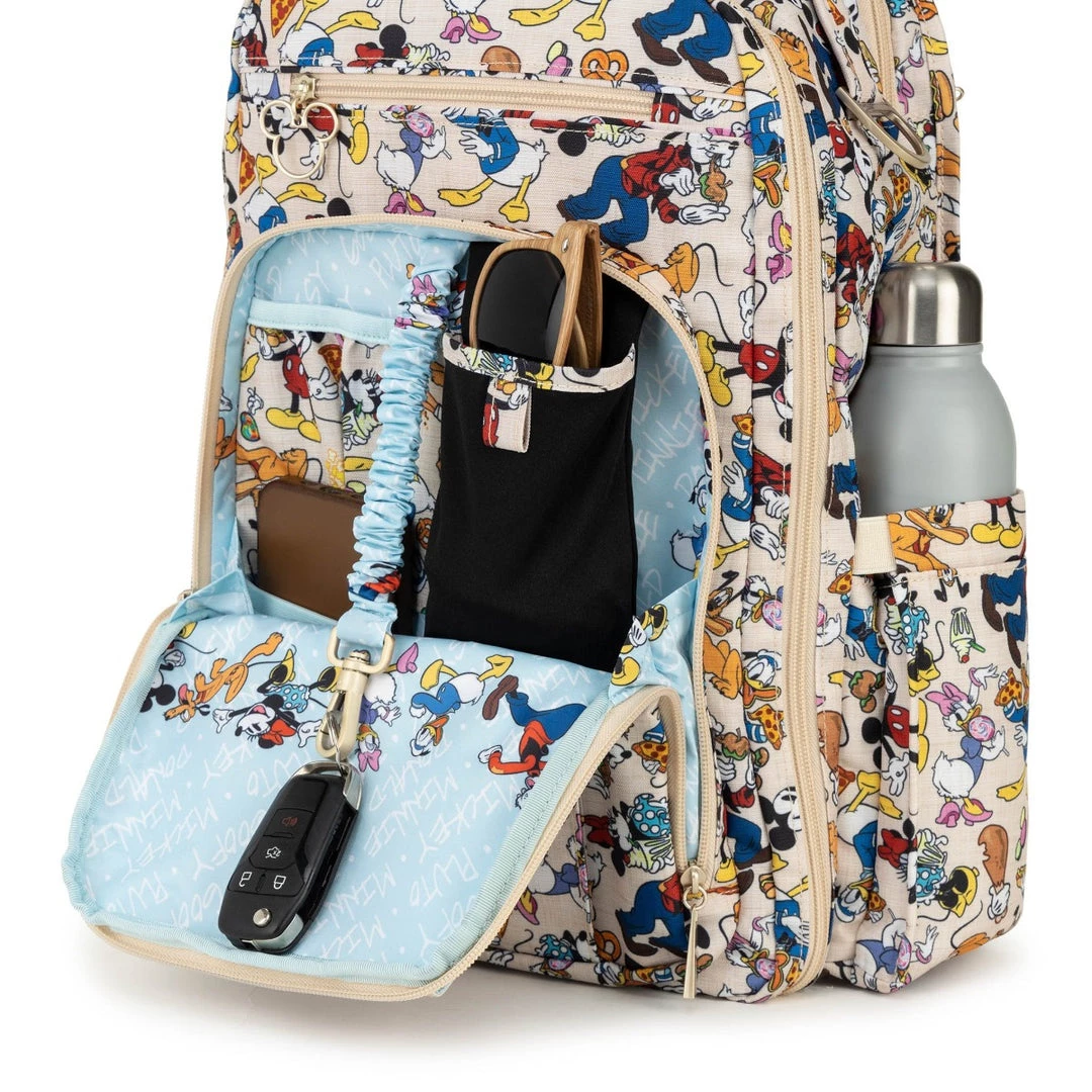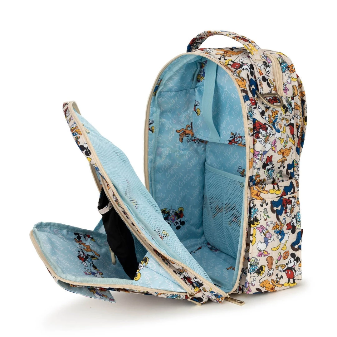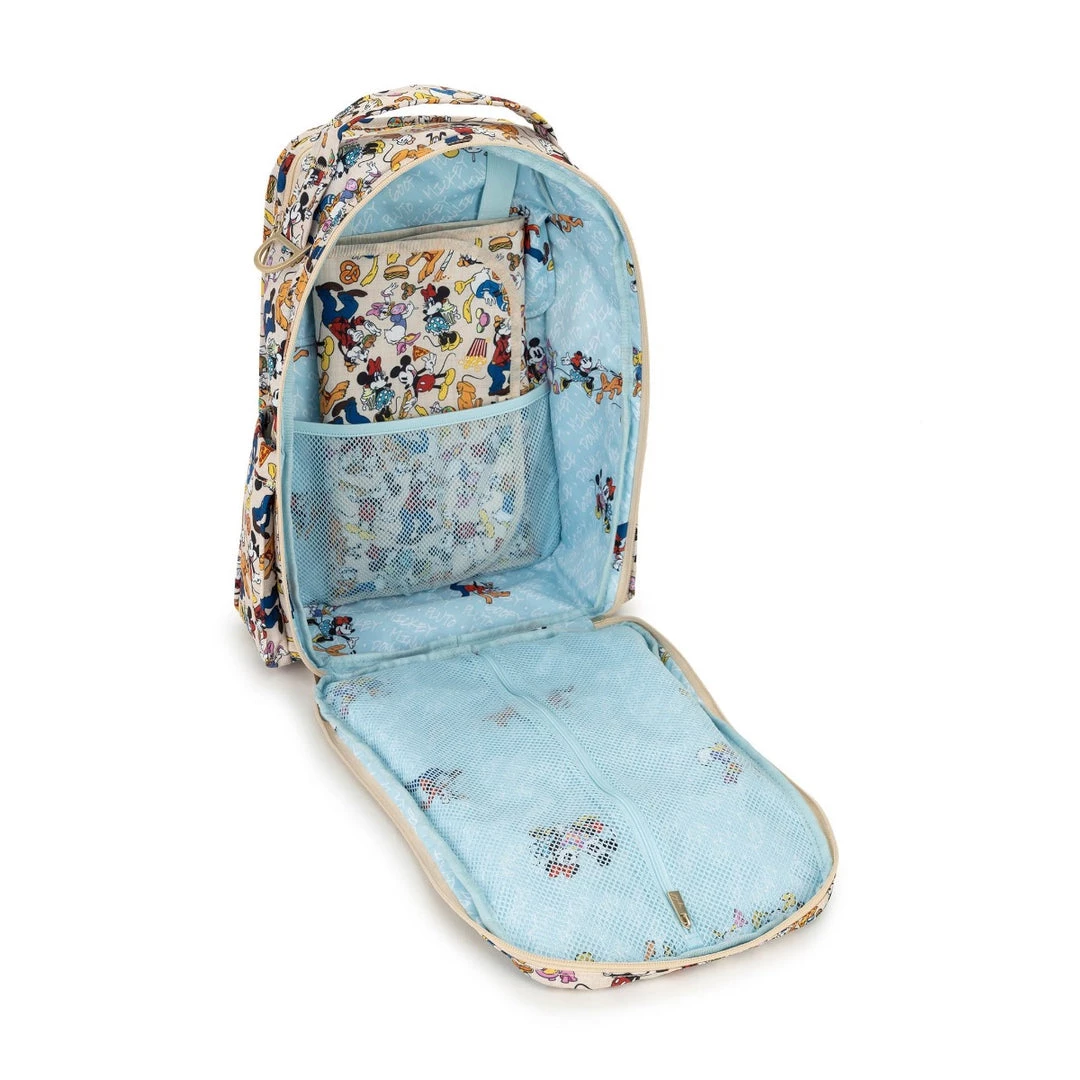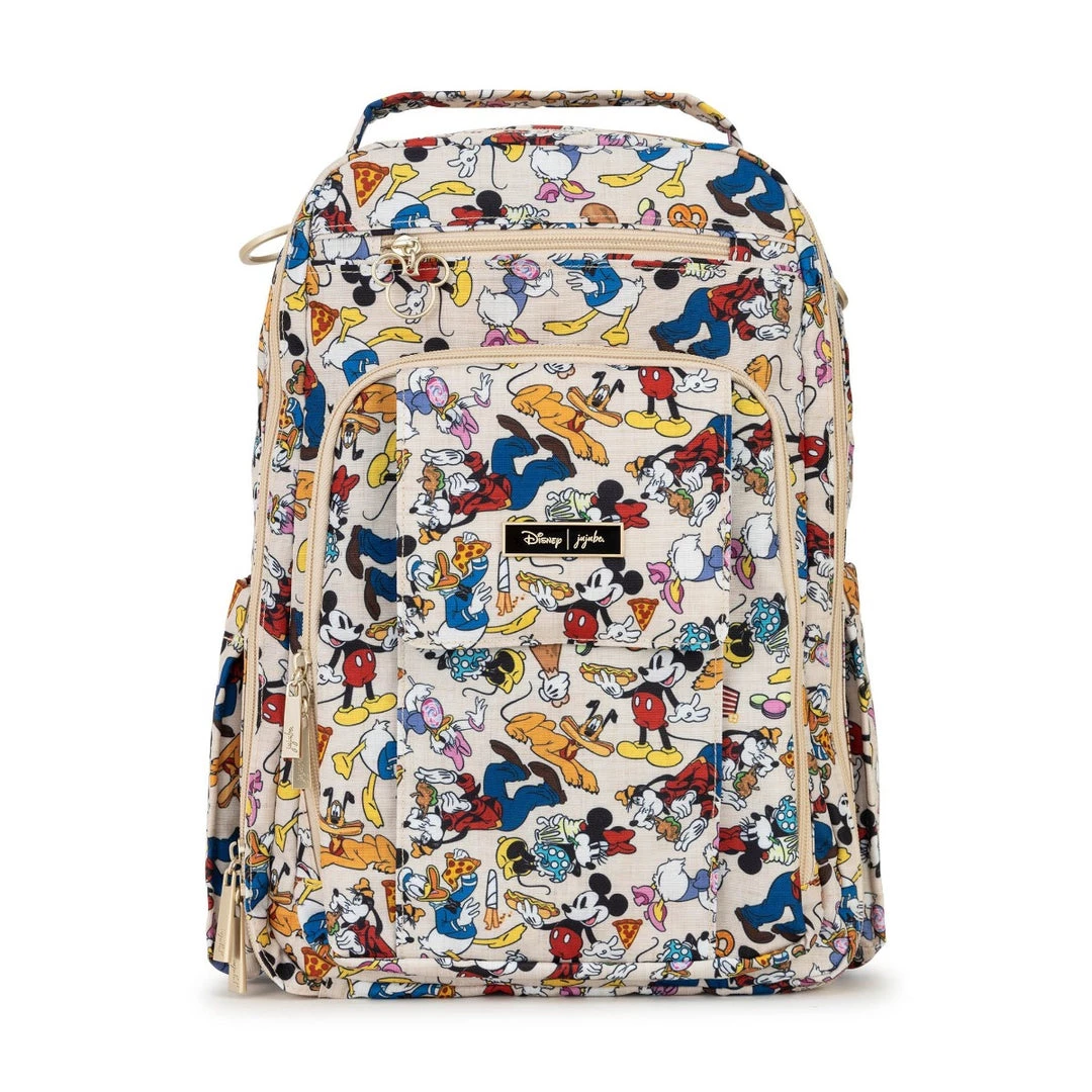 Disney’s Sensational Six meets Sensational Snacks! Sketches of Mickey Mouse and friends surrounded by a scrumptious smorgasbord decorate this Disney x JuJuBe print! Designed by longtime Disney illustrator, Jeff Shelly, his bright and colorful art brings deliciousness to life upon linen colored Chromatics fabric. Mickey, Minnie Mouse, Donald Duck, Daisy Duck, Goofy, and Pluto are all enjoying yummy foods in this design! Peek inside to spy a dusty blue lining printed with the name of each snacker along with sweet vignettes of the darling duos. Accented with satin gold hardware, including an outlined Mickey Mouse zipper pull on select bags, this delicious print will satisfy your cravings!