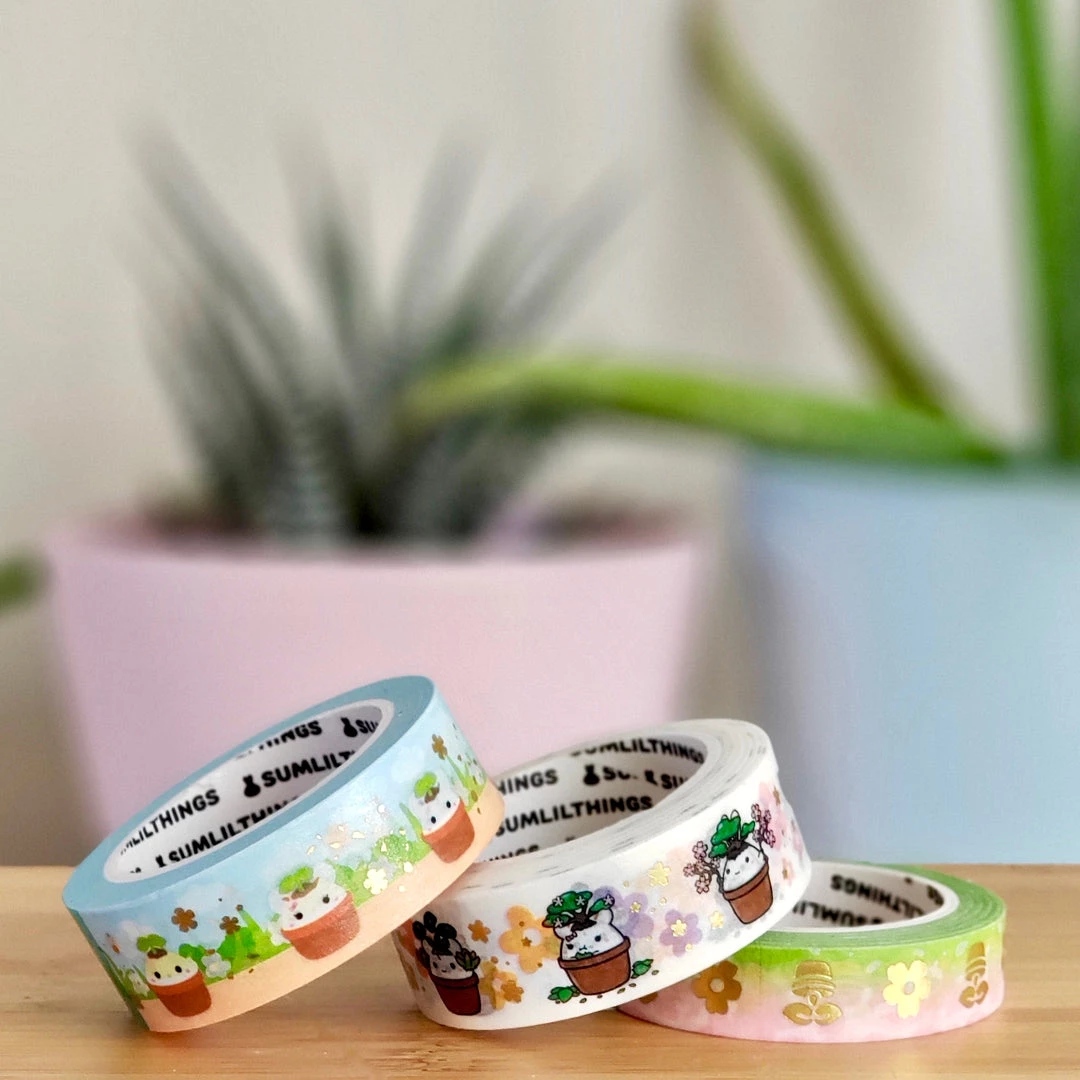 Set of 3 washi tapes with holo gold foil accents featuring all the Lil’ MisfitsΒ as cute potted plants in this greenhouse plant theme!