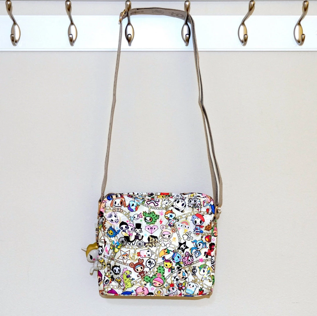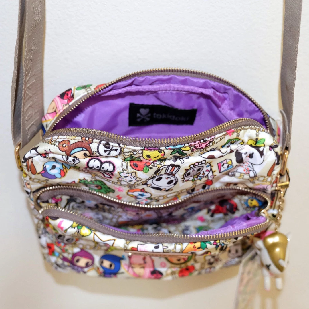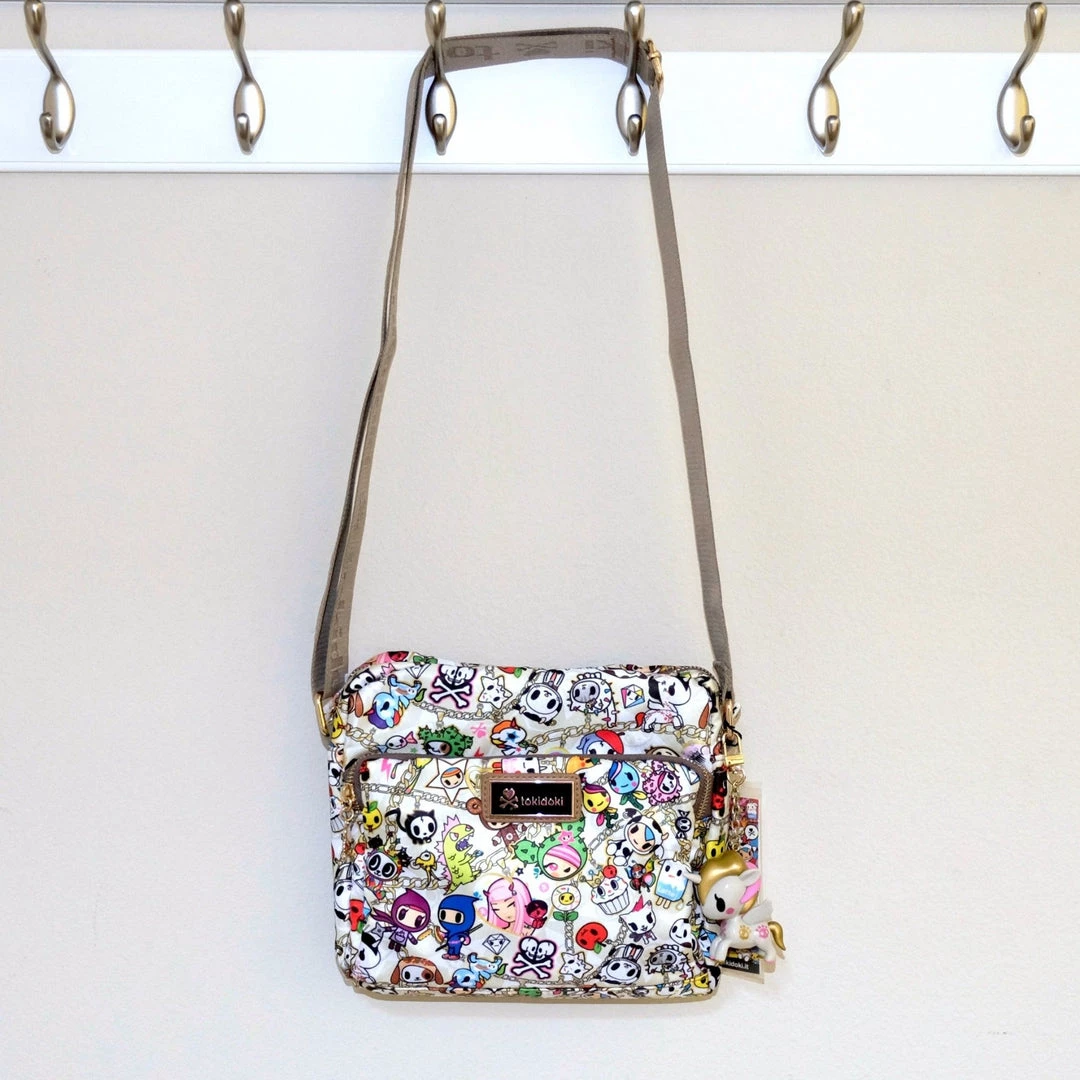 Hard-to-find Chained Love Collection by tokidoki! With an adjustable strap, this super kawaii bag can be used as a crossbody or regular shoulder bag. There are two gold tone zippered compartments, with a cheerful, amethyst purple lining. And, of course, the bag comes with a special Unicorno keychain! The perfect accessory for the kawaii fashionista or fashionisto.